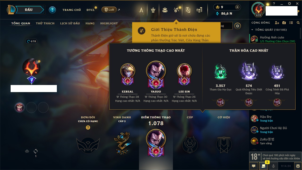 Rank Đơn: Bạc IIIKhung: Chưa có khungTướng: 171 - Còn 21493 THXTrang Phục: 252Rank ĐTCL: Bạch Kim IVLinh Thú: 123