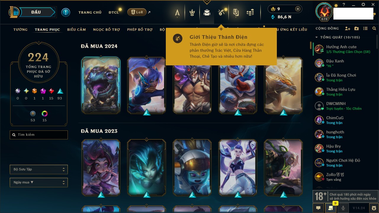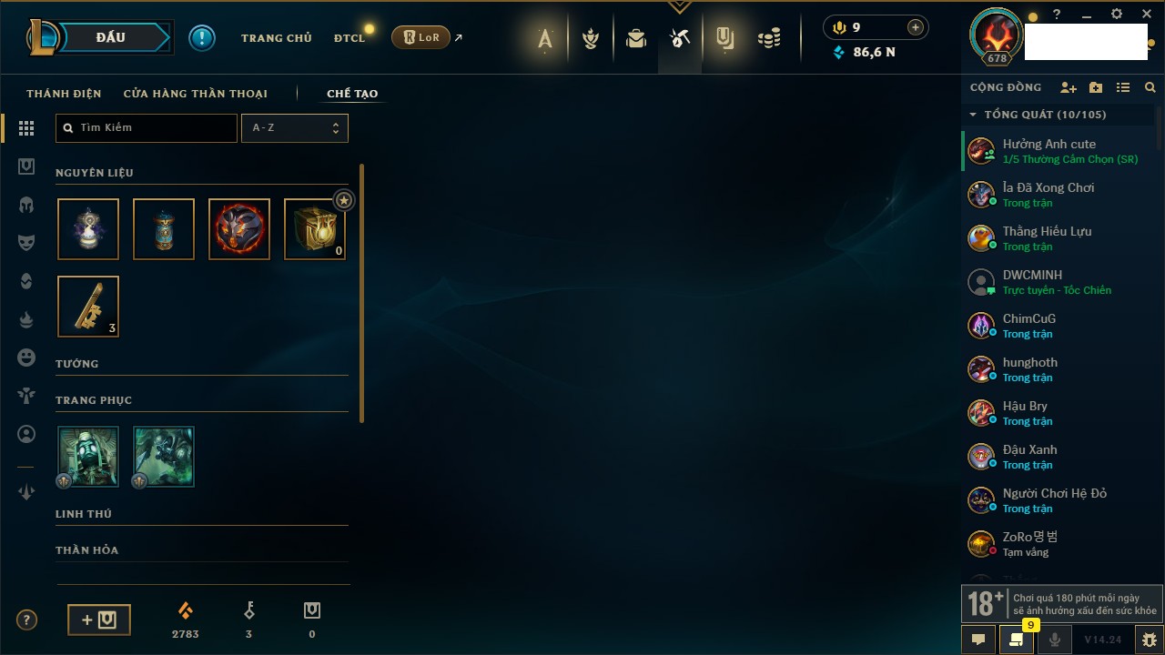 Rank Đơn: Vàng IIKhung: VàngTướng: 171 - Còn 34018 THXTrang Phục: 250Rank ĐTCL: Sắt IILinh Thú: 19