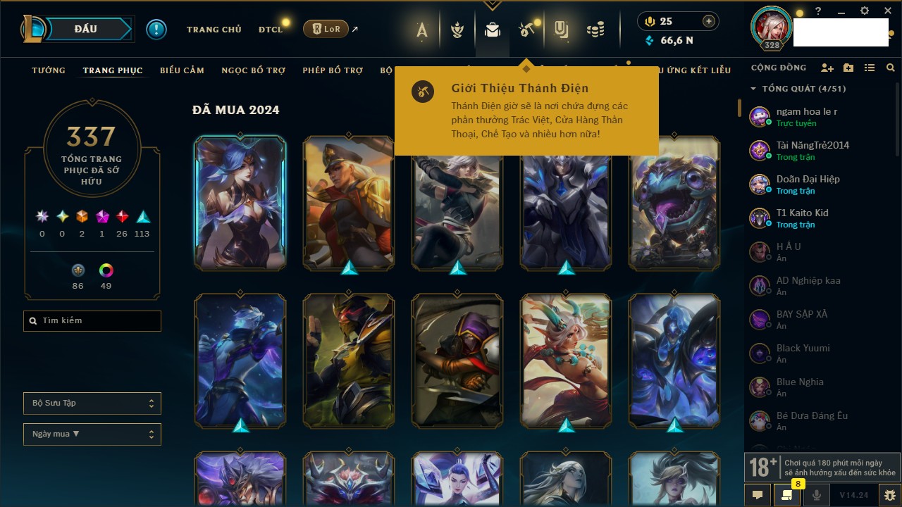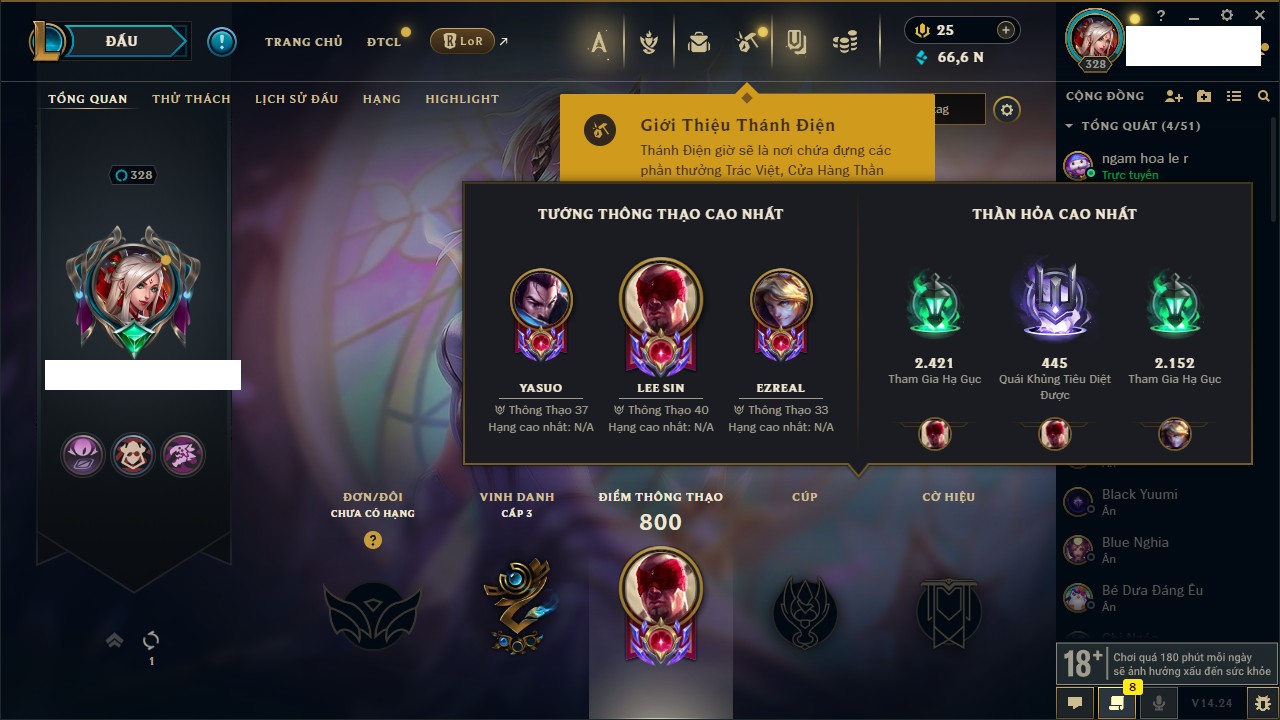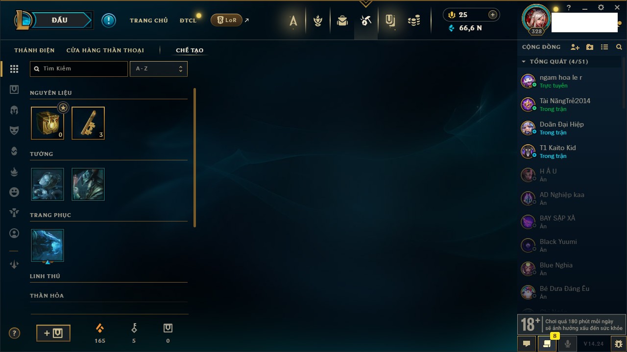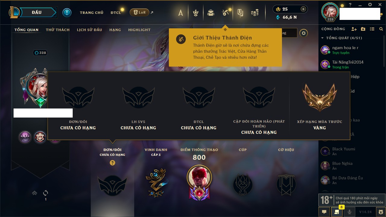 Rank Đơn: Vàng IKhung: BạcTướng: 171 - Còn 60584 THXTrang Phục: 286Rank ĐTCL: Vàng IIILinh Thú: 117
