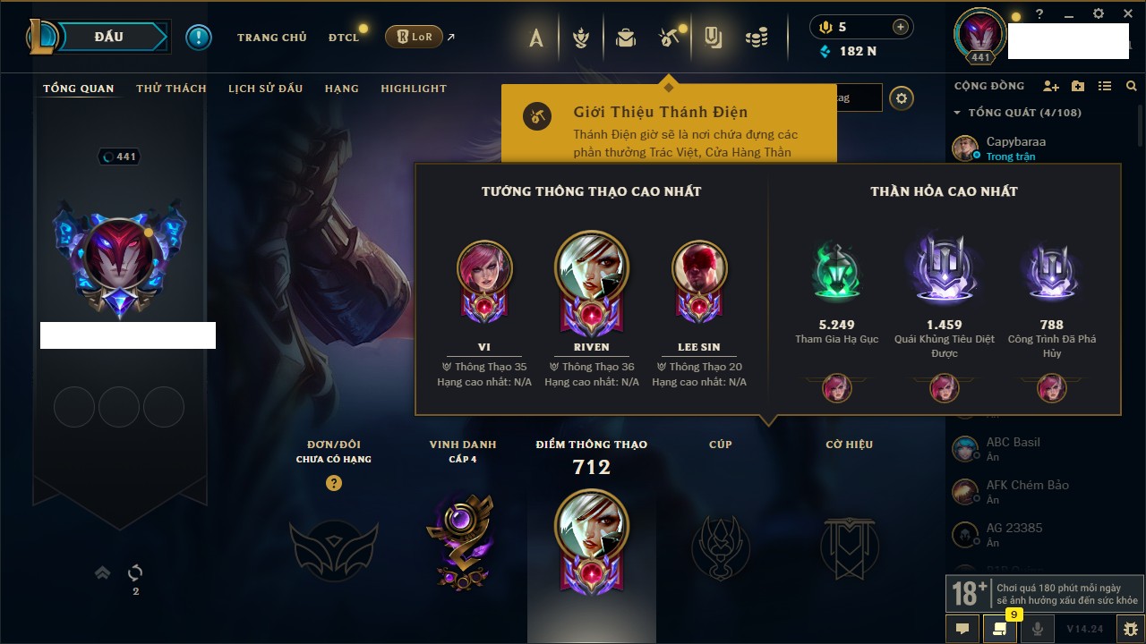 Rank Đơn: Bạch Kim IIKhung: Bạch kimTướng: 171 - Còn 316137 THXTrang Phục: 89Rank ĐTCL: Bạch Kim IIILinh Thú: 94