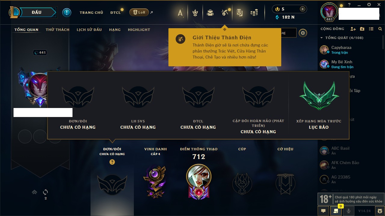 Rank Đơn: Lục Bảo IVKhung: VàngTướng: 171 - Còn 154648 THXTrang Phục: 203Rank ĐTCL: Bạch Kim IVLinh Thú: 69