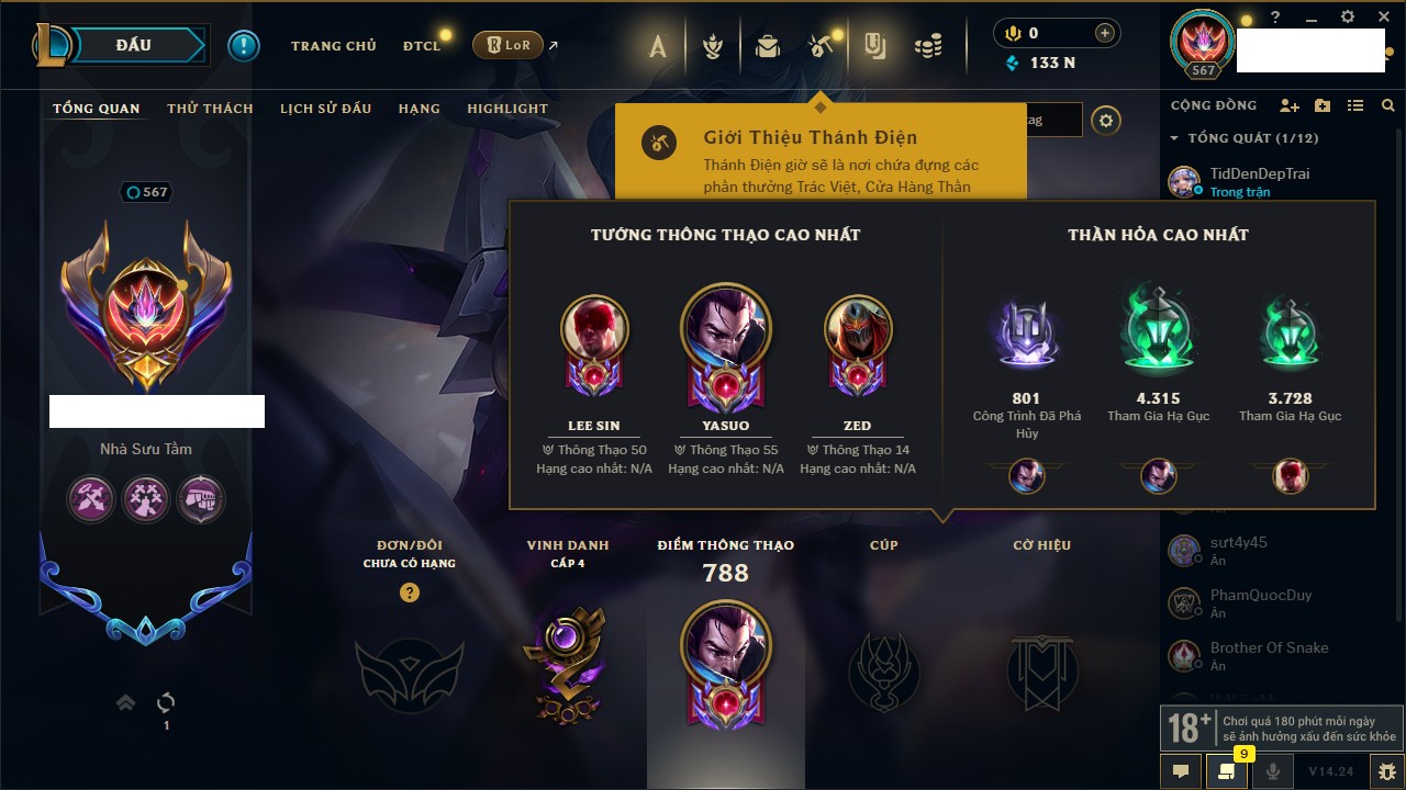 - Cấp 527 - 180,925 IP - Yasuo 634,686 Thông Thạo