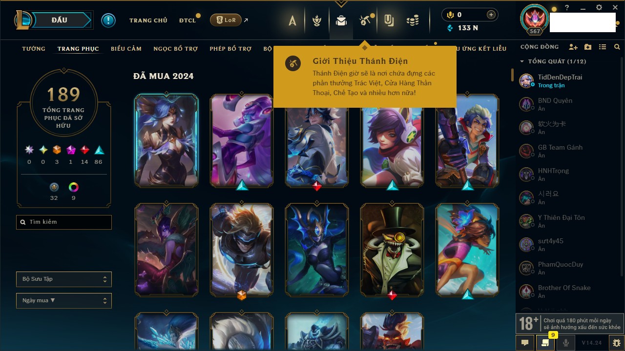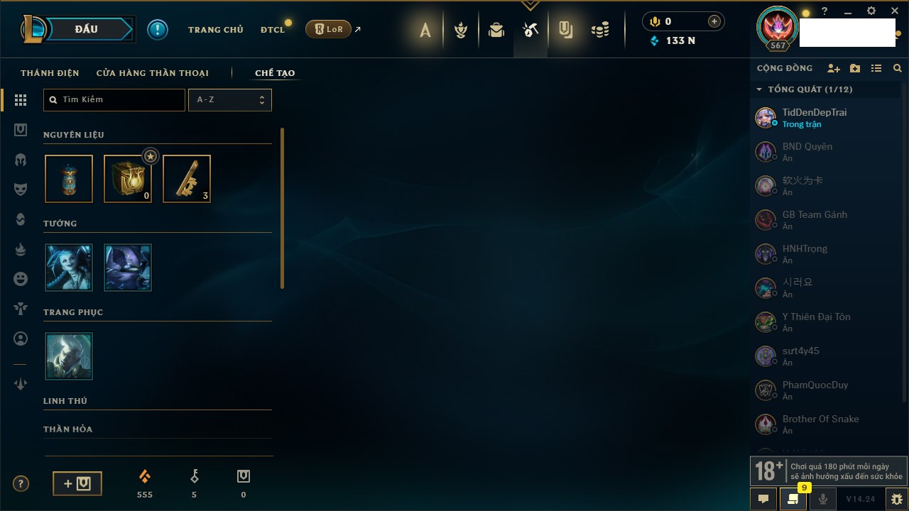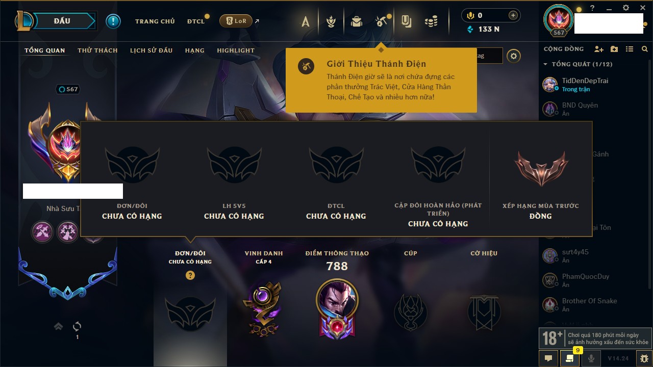 Rank Đơn: Vàng IVKhung: BạcTướng: 171 - Còn 231097 THXTrang Phục: 180Rank ĐTCL: Vàng IVLinh Thú: 110