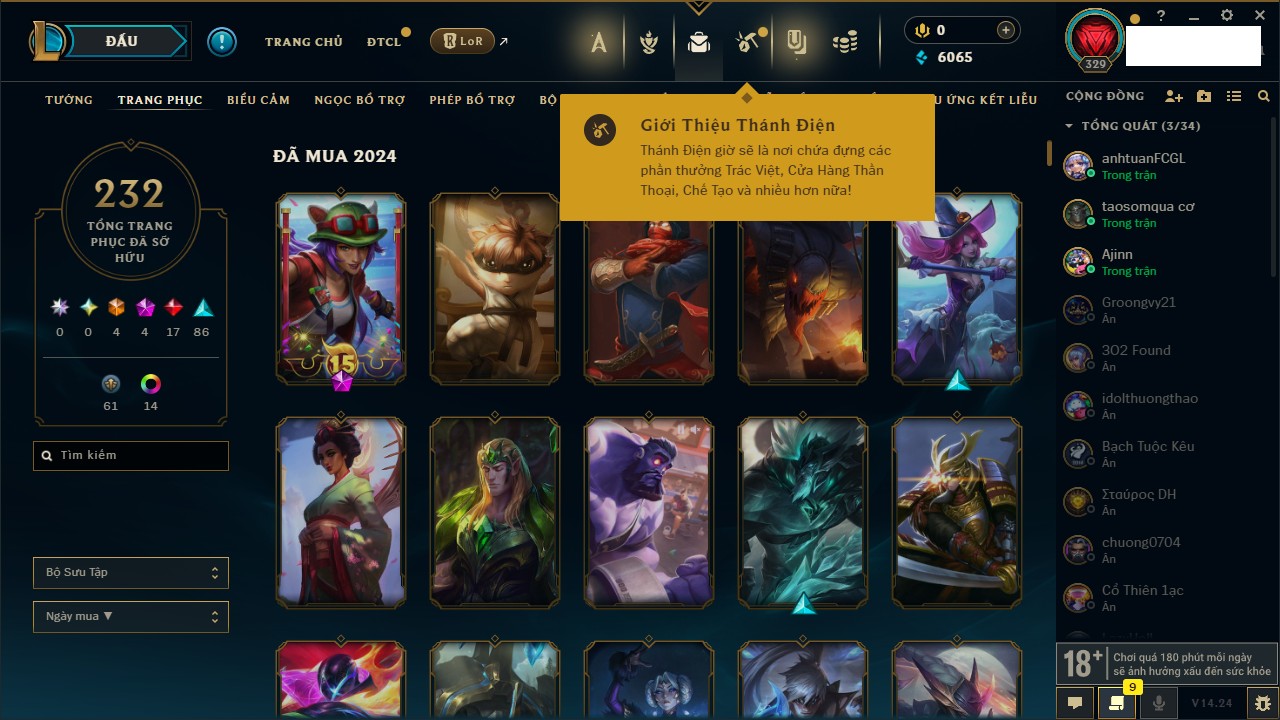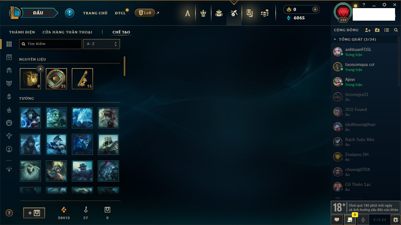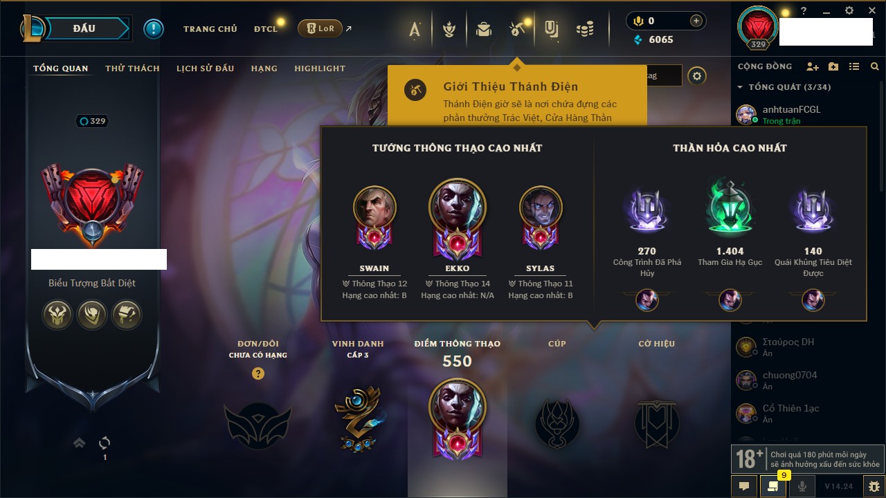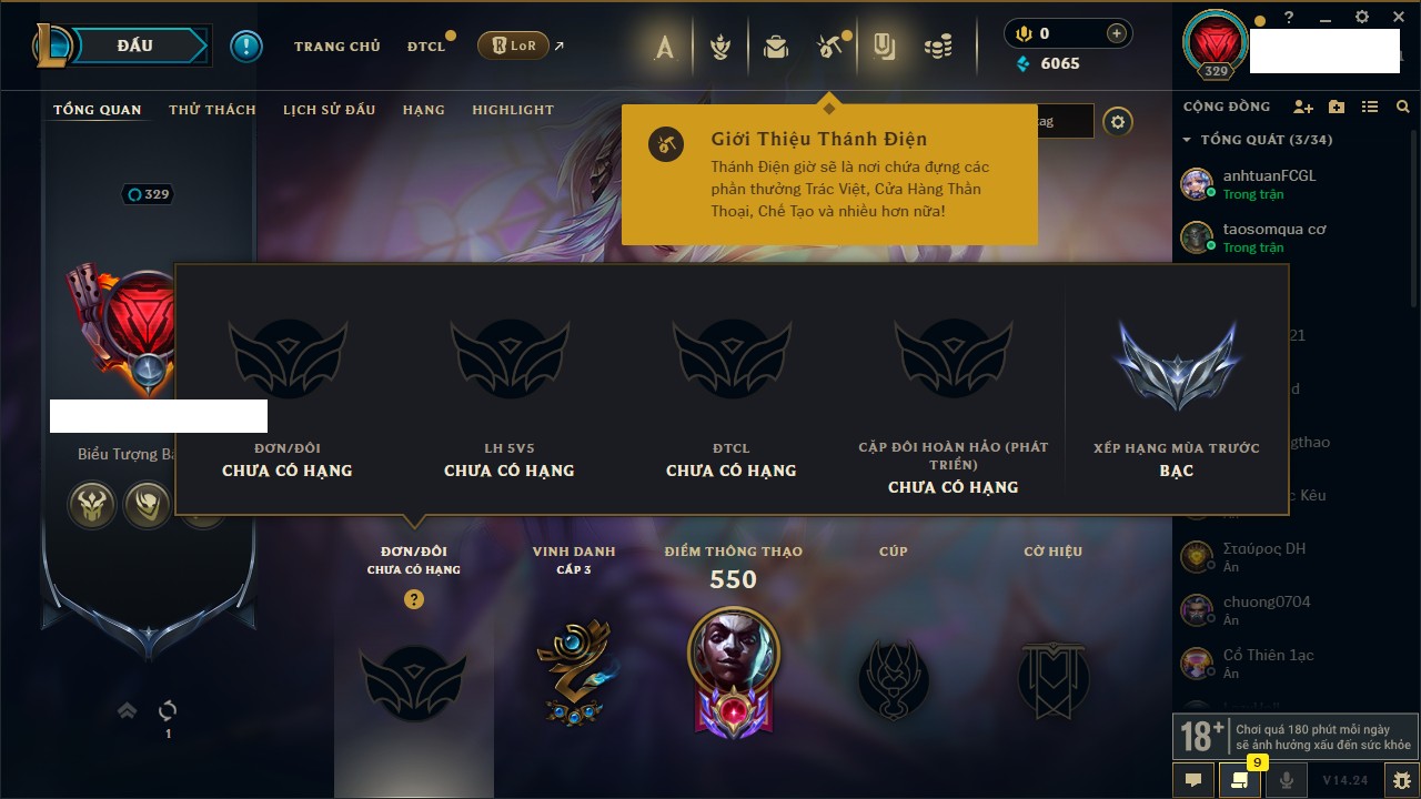 Rank Đơn: Bạc IIIKhung: BạcTướng: 171 - Còn 51045 THXTrang Phục: 220Rank ĐTCL: Sắt IILinh Thú: 141