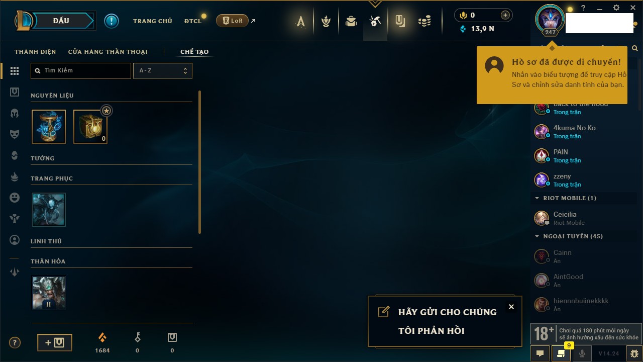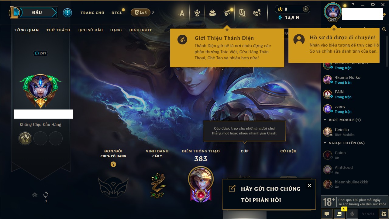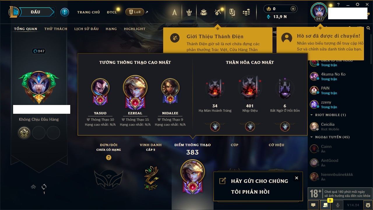 Rank Đơn: Chưa RankKhung: Chưa có khungTướng: 157 - Còn 6783 THXTrang Phục: 50Rank ĐTCL: Chưa RankLinh Thú: 37