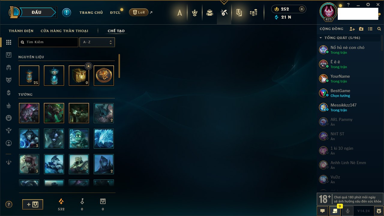 Rank Đơn: Lục Bảo IVKhung: VàngTướng: 171 - Còn 154648 THXTrang Phục: 203Rank ĐTCL: Bạch Kim IVLinh Thú: 69