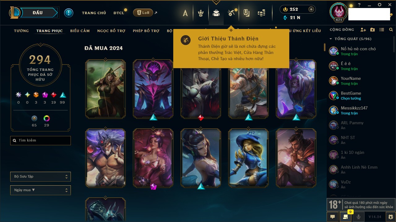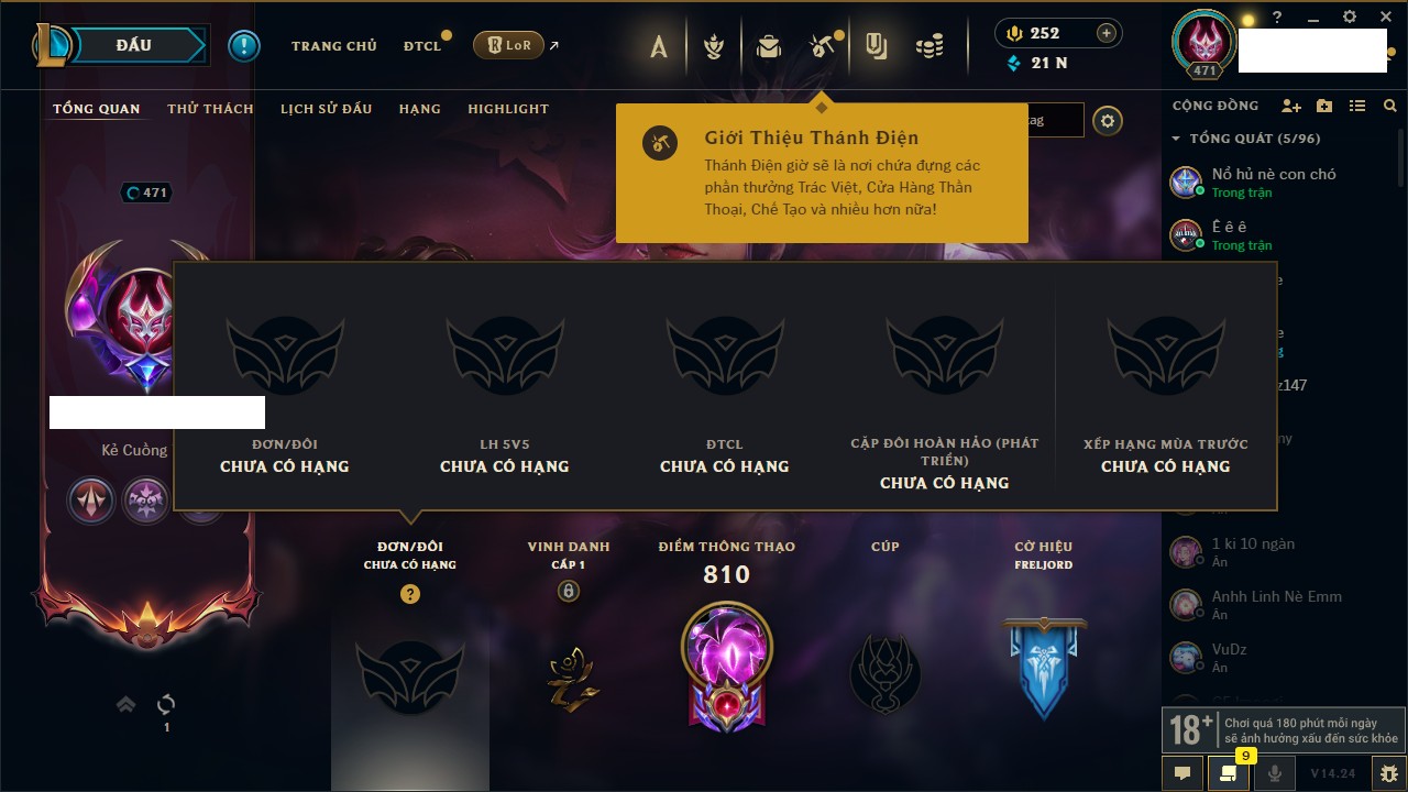 Rank Đơn: Vàng IIIKhung: VàngTướng: 172 - Còn 164704 THXTrang Phục: 255Rank ĐTCL: Kim Cương IVLinh Thú: 156