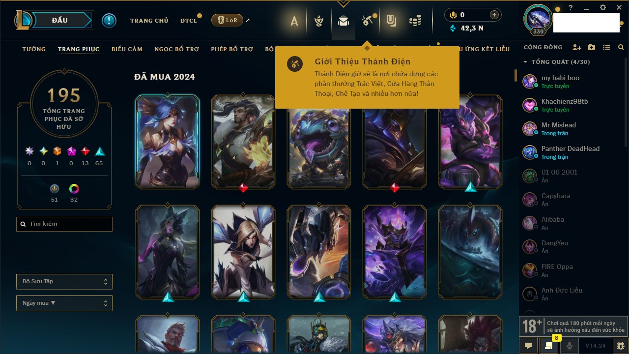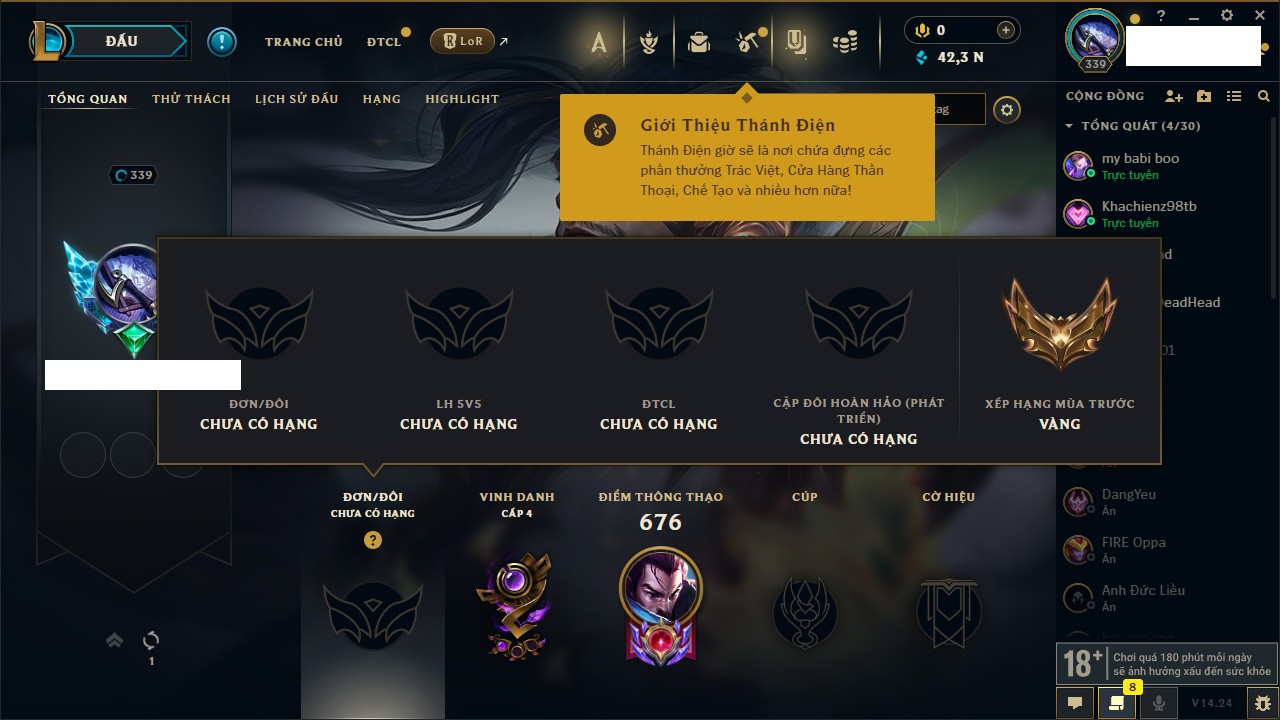 Rank Đơn: Bạc IIKhung: VàngTướng: 171 - Còn 332462 THXTrang Phục: 165Rank ĐTCL: Kim Cương IVLinh Thú: 181