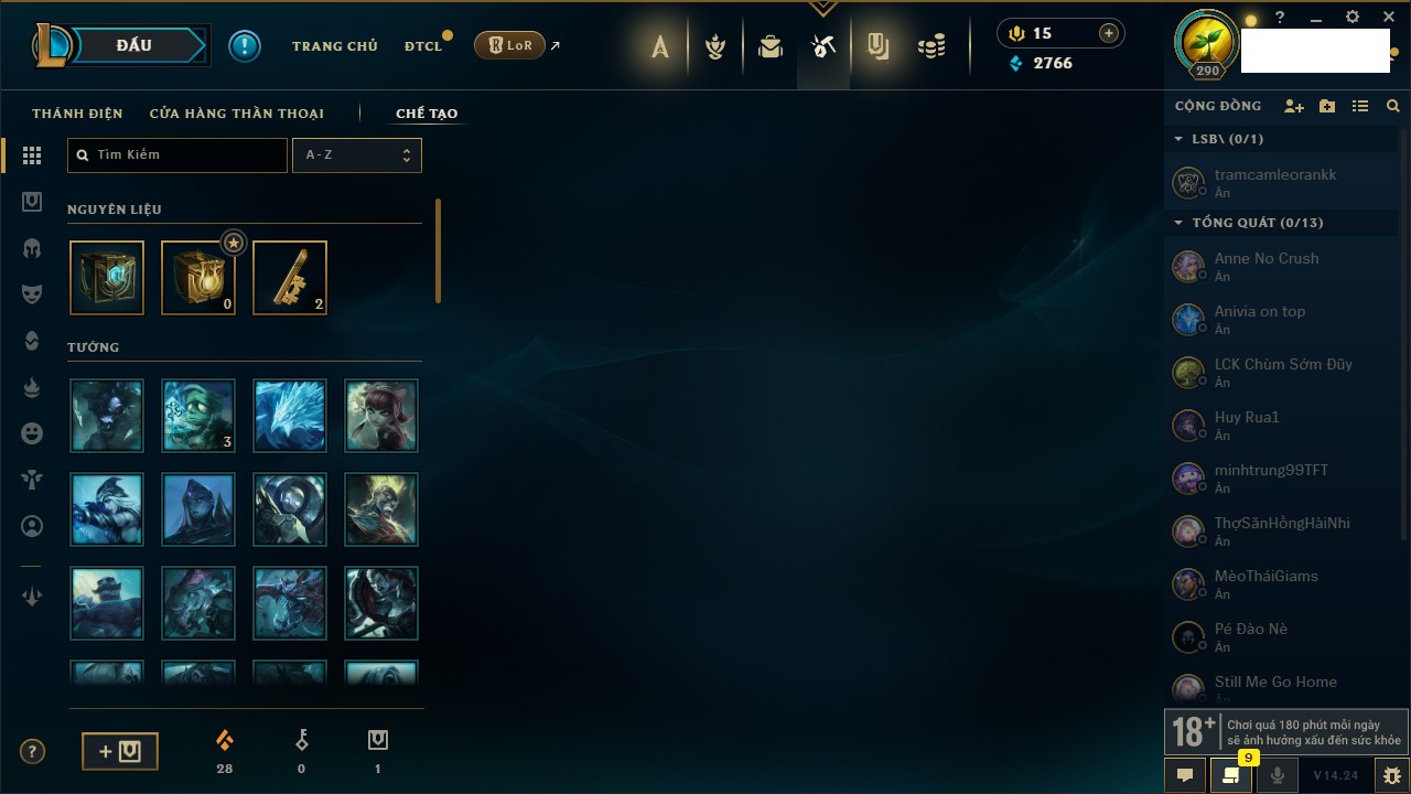 Rank Đơn: Đồng IIKhung: Chưa có khungTướng: 170 - Còn 56487 THXTrang Phục: 90Rank ĐTCL: Chưa RankLinh Thú: 129