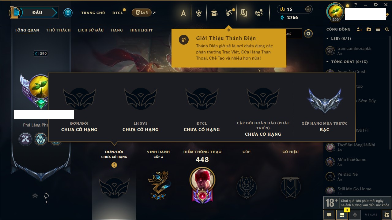 Rank Đơn: Vàng IVKhung: VàngTướng: 146 - Còn 89110 THXTrang Phục: 63Rank ĐTCL: Vàng IIILinh Thú: 41