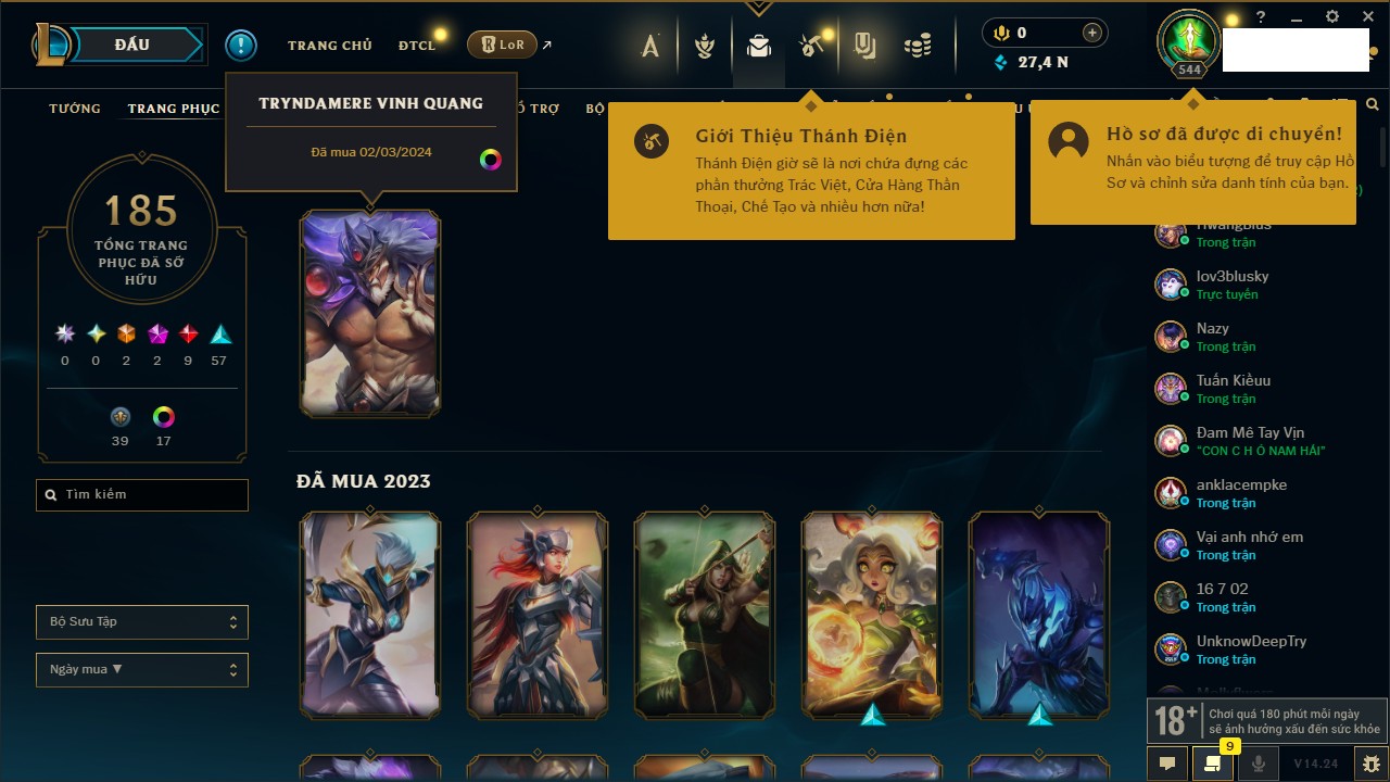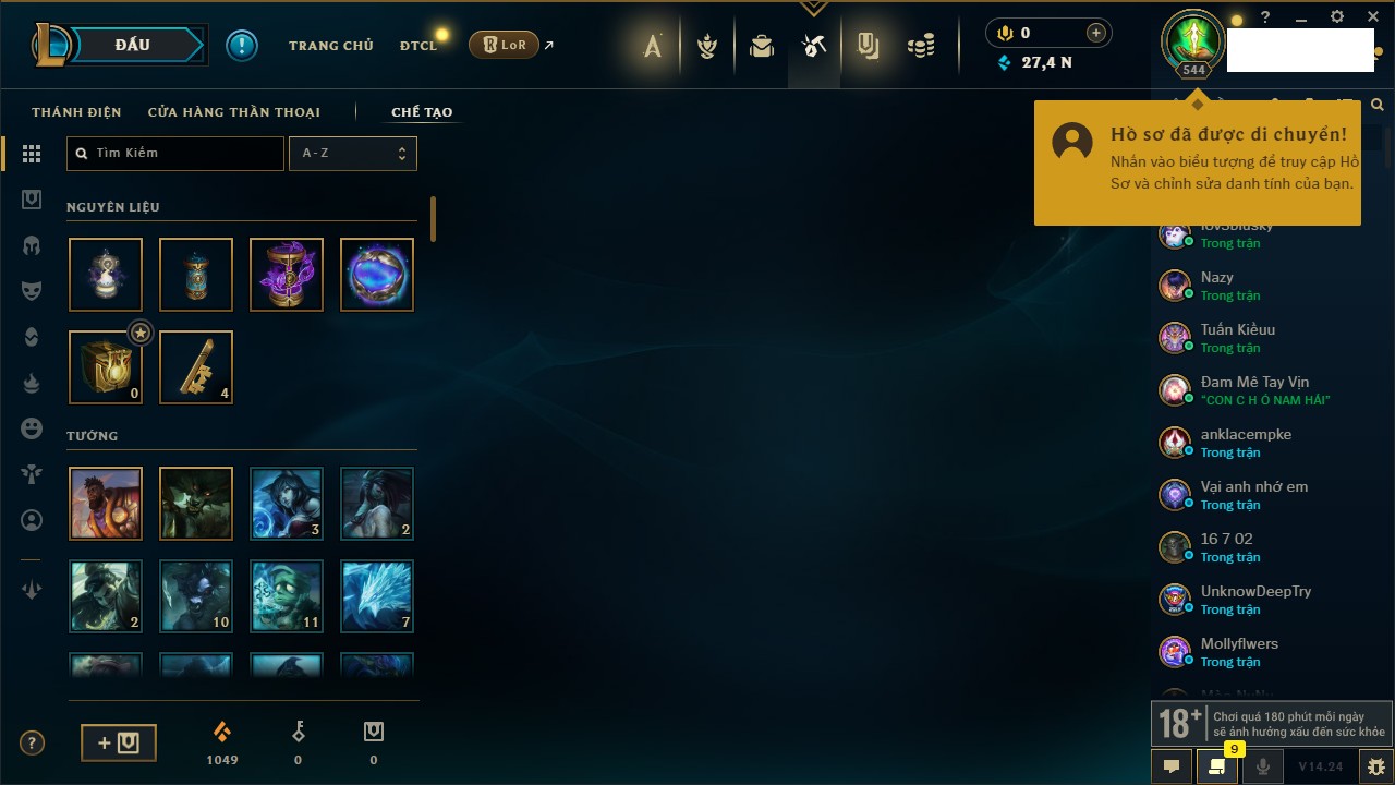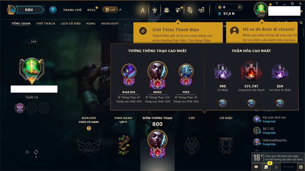 Rank Đơn: Vàng IIIKhung: BạcTướng: 171 - Còn 101359 THXTrang Phục: 88Rank ĐTCL: Kim Cương IVLinh Thú: 200