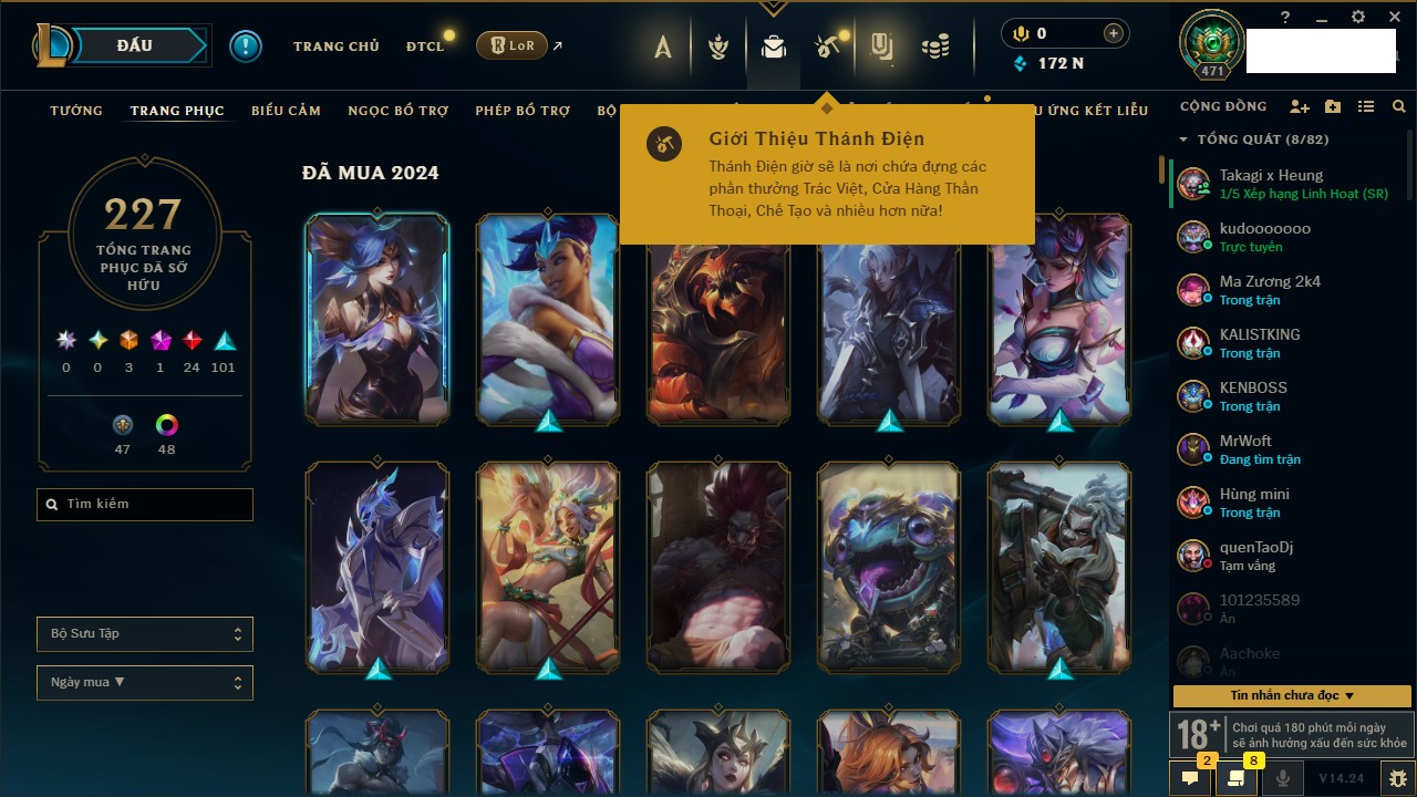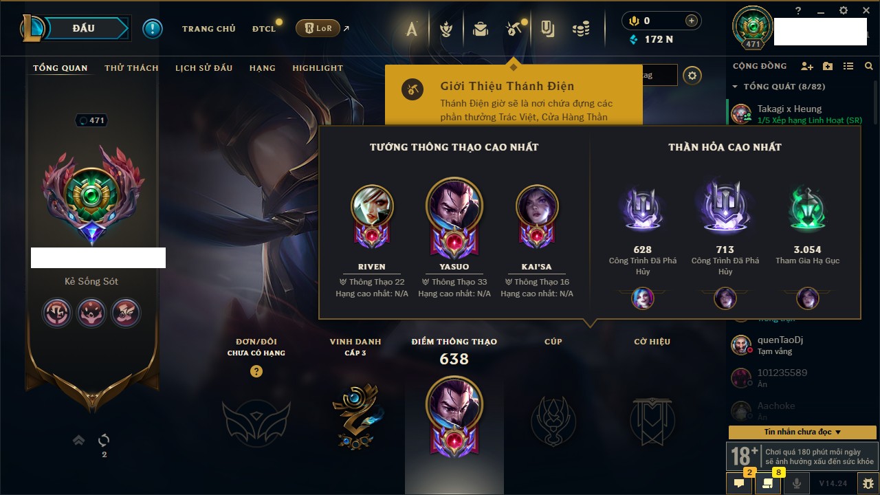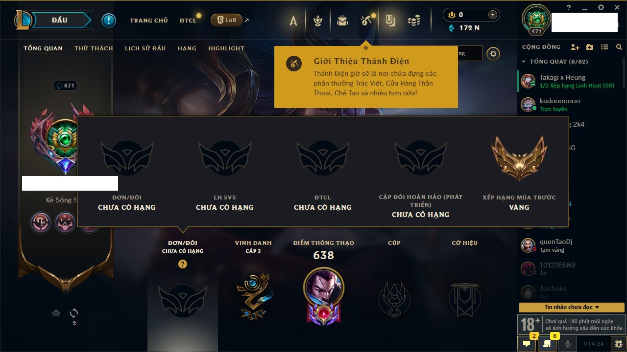 Rank Đơn: Bạc IIIKhung: BạcTướng: 171 - Còn 51045 THXTrang Phục: 220Rank ĐTCL: Sắt IILinh Thú: 141