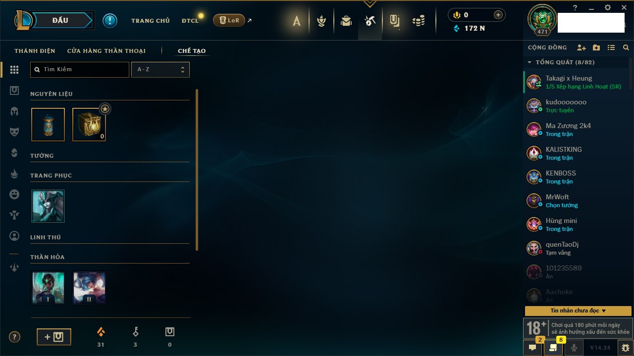 Rank Đơn: Vàng IVKhung: VàngTướng: 170 - Còn 84355 THXTrang Phục: 199Rank ĐTCL: Chưa RankLinh Thú: 116