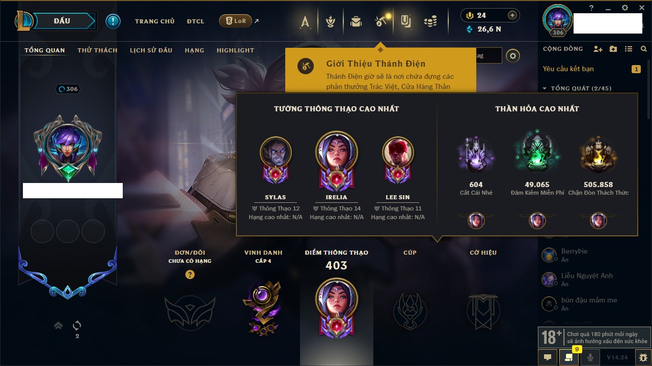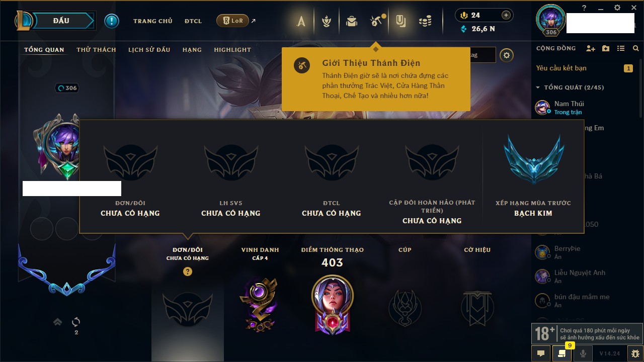 Rank Đơn: Bạc IIIKhung: Chưa có khungTướng: 171 - Còn 21493 THXTrang Phục: 252Rank ĐTCL: Bạch Kim IVLinh Thú: 123