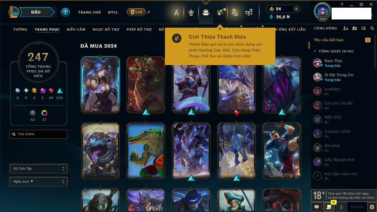 Rank Đơn: Vàng IIIKhung: VàngTướng: 171 - Còn 159339 THXTrang Phục: 218Rank ĐTCL: Lục Bảo IIILinh Thú: 151