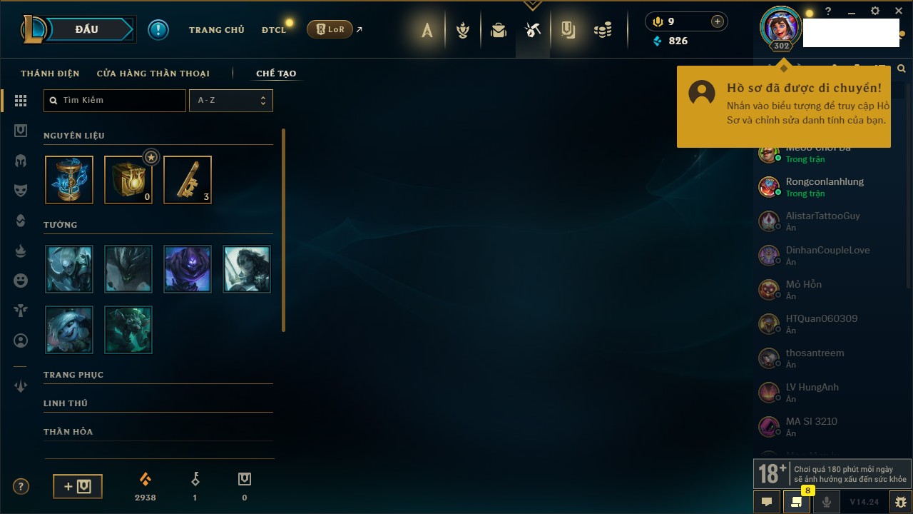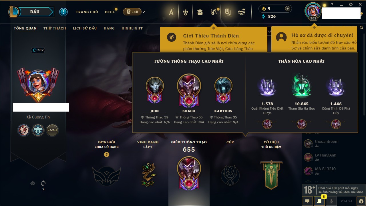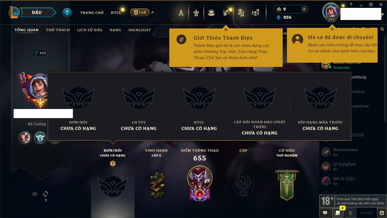 Rank Đơn: Vàng IVKhung: VàngTướng: 146 - Còn 89110 THXTrang Phục: 63Rank ĐTCL: Vàng IIILinh Thú: 41