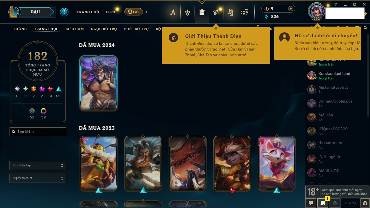 Rank Đơn: Chưa RankKhung: Chưa có khungTướng: 168 - Còn 70824 THXTrang Phục: 155Rank ĐTCL: Chưa RankLinh Thú: 53