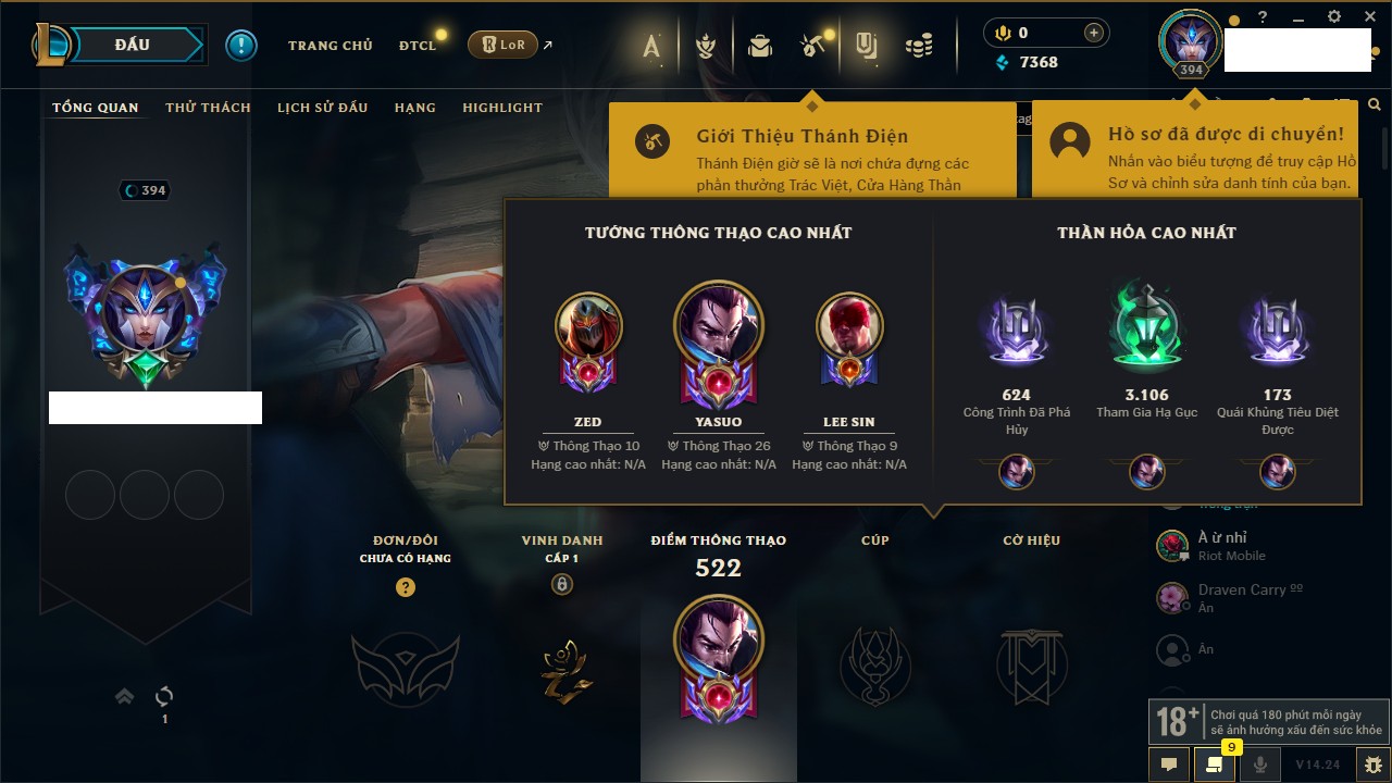 Rank Đơn: Chưa RankKhung: Chưa có khungTướng: 168 - Còn 70824 THXTrang Phục: 155Rank ĐTCL: Chưa RankLinh Thú: 53