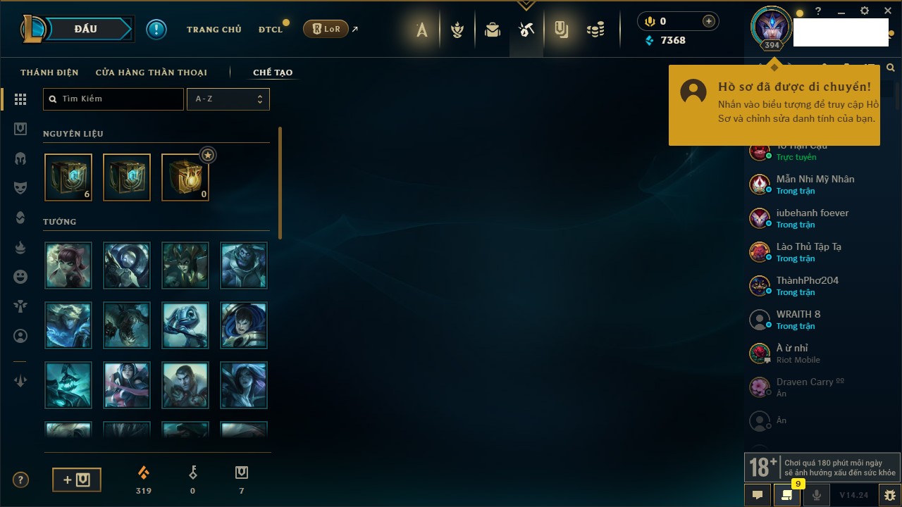 Rank Đơn: Chưa RankKhung: Chưa có khungTướng: 157 - Còn 6783 THXTrang Phục: 50Rank ĐTCL: Chưa RankLinh Thú: 37