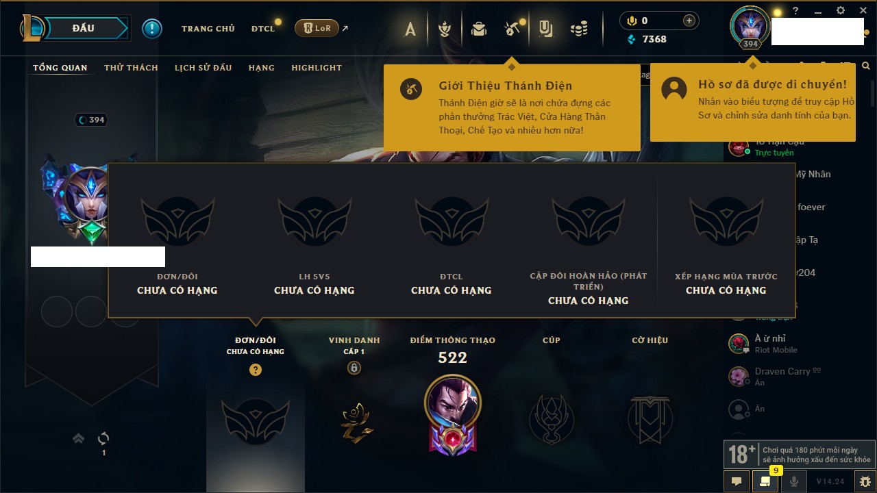 Rank Đơn: Vàng IVKhung: VàngTướng: 146 - Còn 89110 THXTrang Phục: 63Rank ĐTCL: Vàng IIILinh Thú: 41