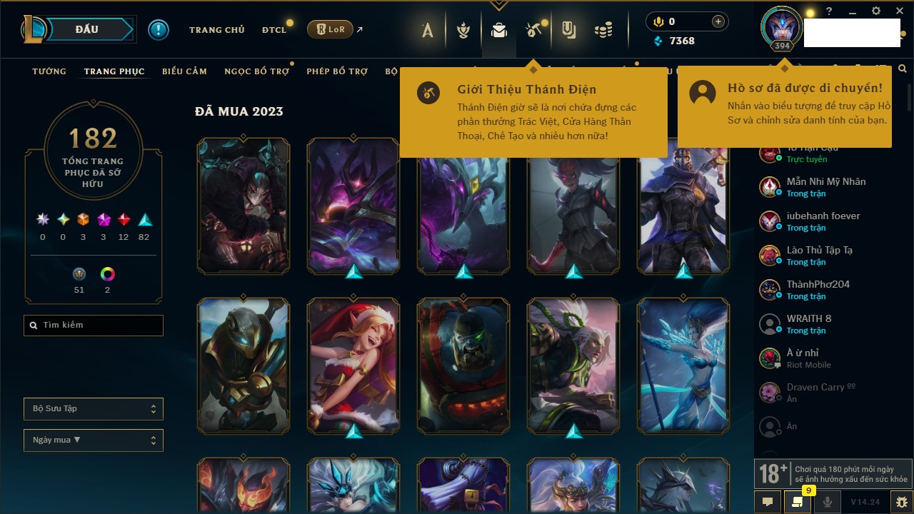 Rank Đơn: Đồng IIKhung: Chưa có khungTướng: 170 - Còn 56487 THXTrang Phục: 90Rank ĐTCL: Chưa RankLinh Thú: 129