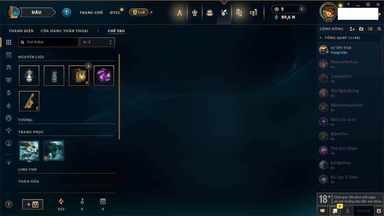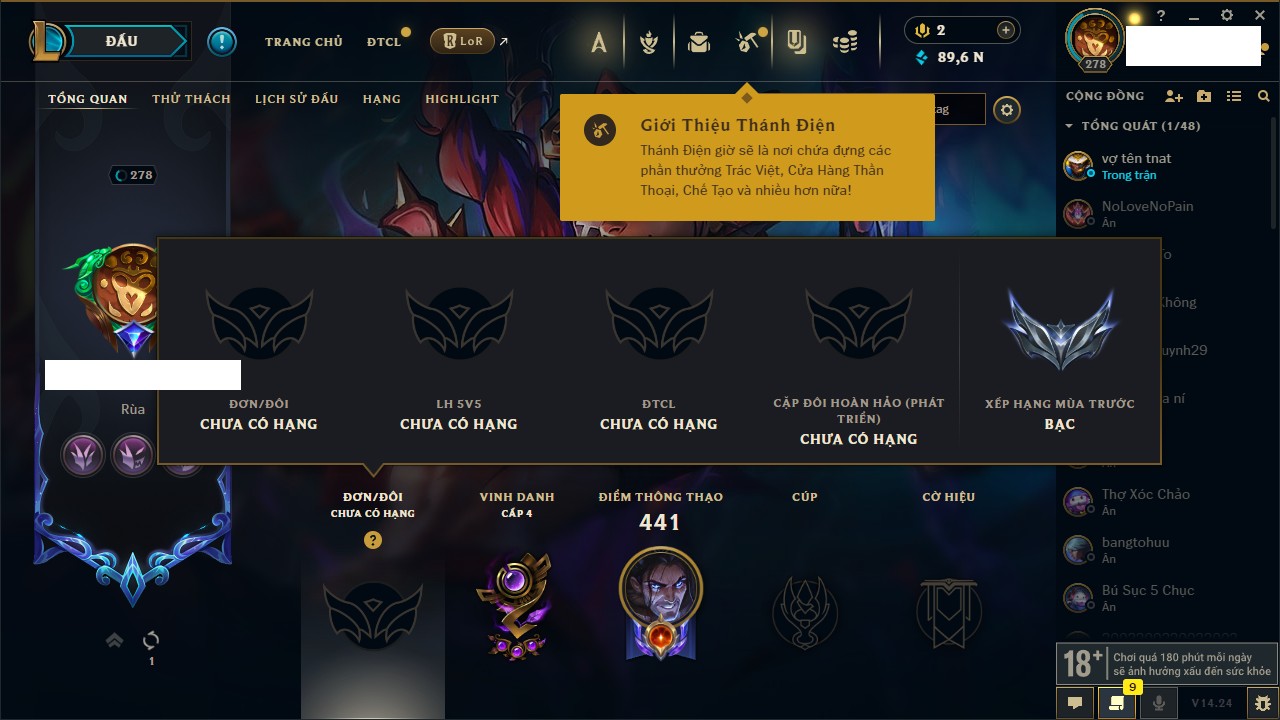 Rank Đơn: Vàng IKhung: BạcTướng: 171 - Còn 60584 THXTrang Phục: 286Rank ĐTCL: Vàng IIILinh Thú: 117