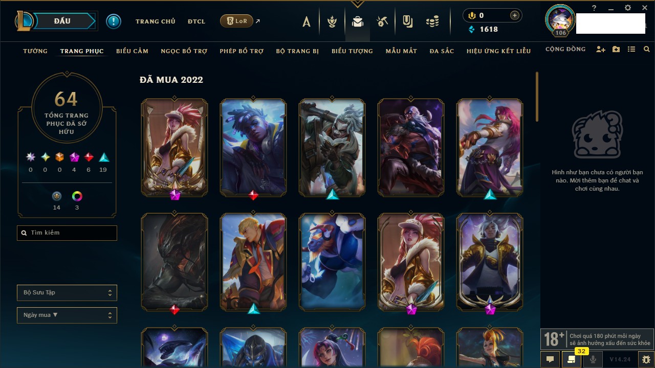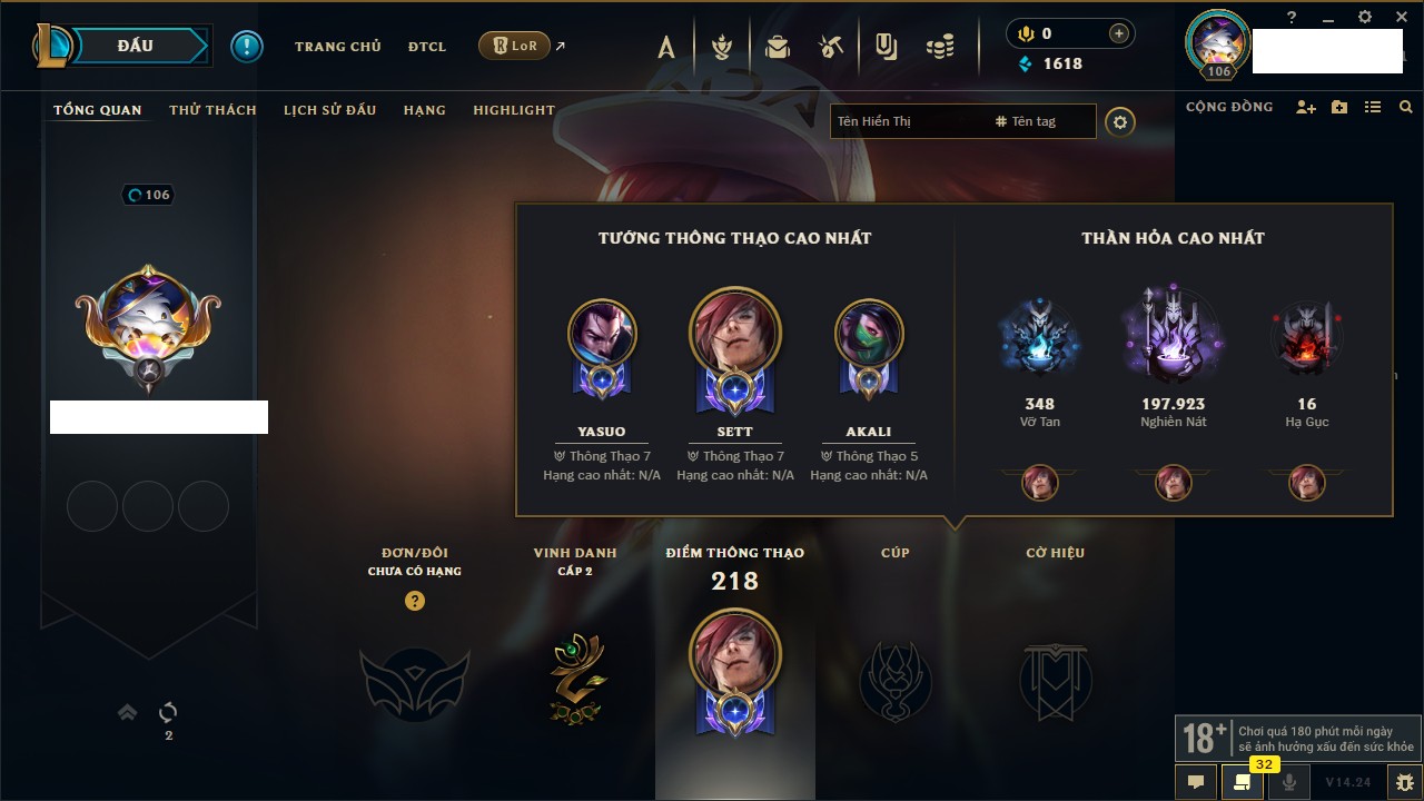 Rank Đơn: Vàng IVKhung: VàngTướng: 158 - Còn 85629 THXTrang Phục: 163Rank ĐTCL: Chưa RankLinh Thú: 177