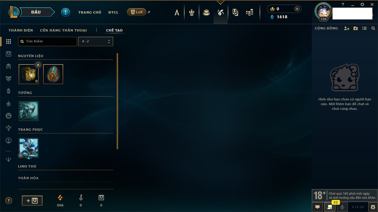 Rank Đơn: Vàng IVKhung: BạcTướng: 171 - Còn 116977 THXTrang Phục: 142Rank ĐTCL: Đồng IILinh Thú: 97