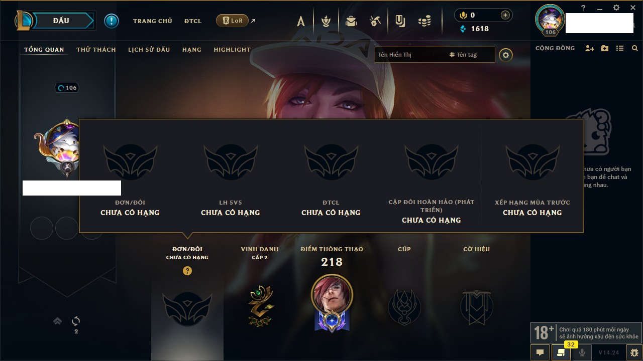 Rank Đơn: Vàng IVKhung: Chưa có khungTướng: 170 - Còn 27840 THXTrang Phục: 77Rank ĐTCL: Chưa RankLinh Thú: 143