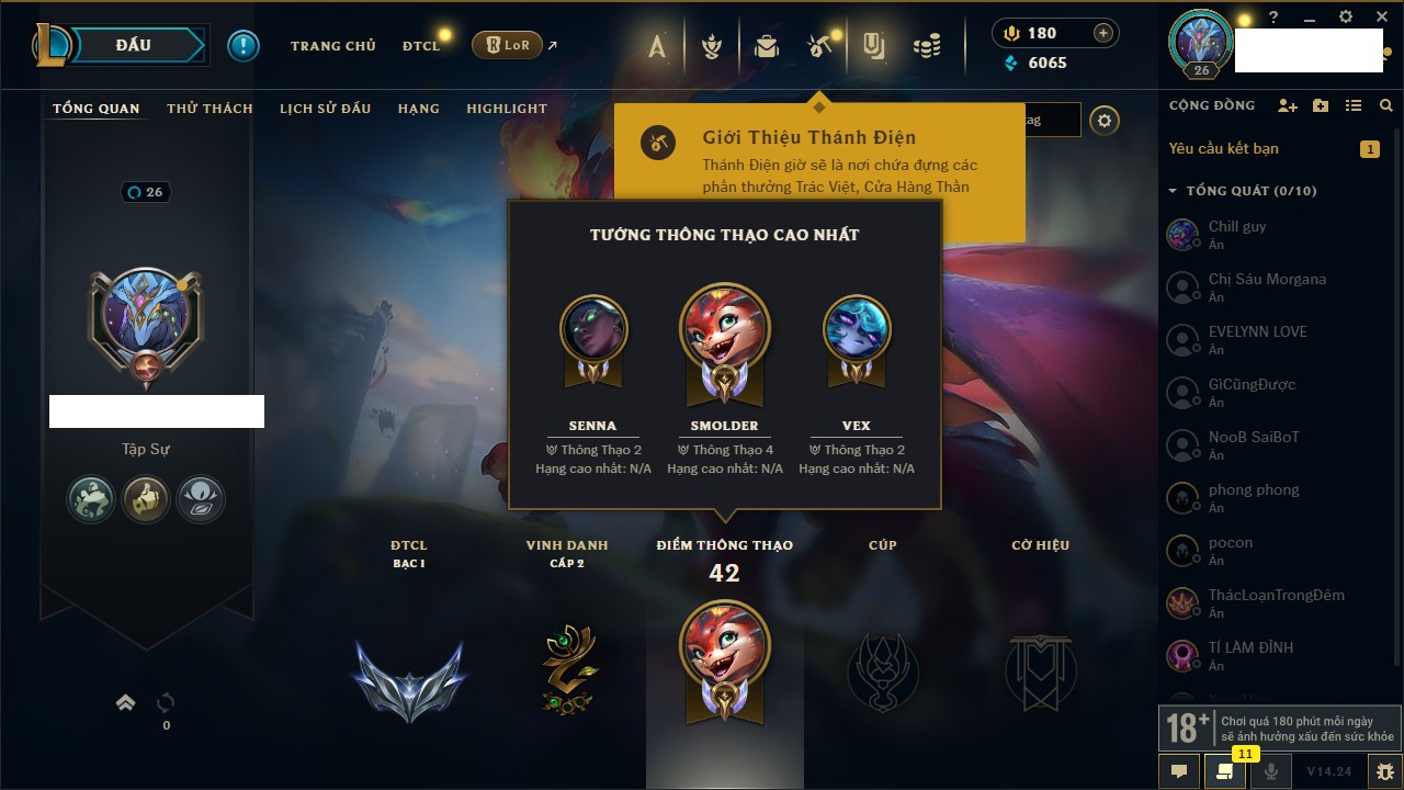 Rank Đơn: Chưa rank mùa nàoKhung: Chưa có khungTướng: 10 - Còn 21800 THXTrang Phục: 0Rank ĐTCL: Bạc ILinh Thú: 33