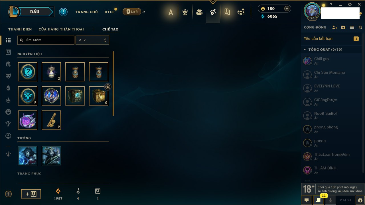 Rank Đơn: Chưa rank mùa nàoKhung: Chưa có khungTướng: 8 - Còn 14835 THXTrang Phục: 1Rank ĐTCL: Chưa RankLinh Thú: 7