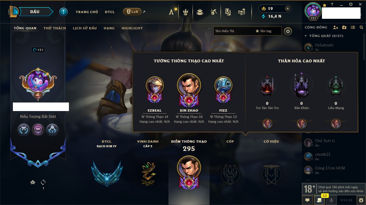 Rank Đơn: Chưa RankKhung: Chưa có khungTướng: 1 - Còn 18000 THXTrang Phục: 0Rank ĐTCL: Chưa RankLinh Thú: 10