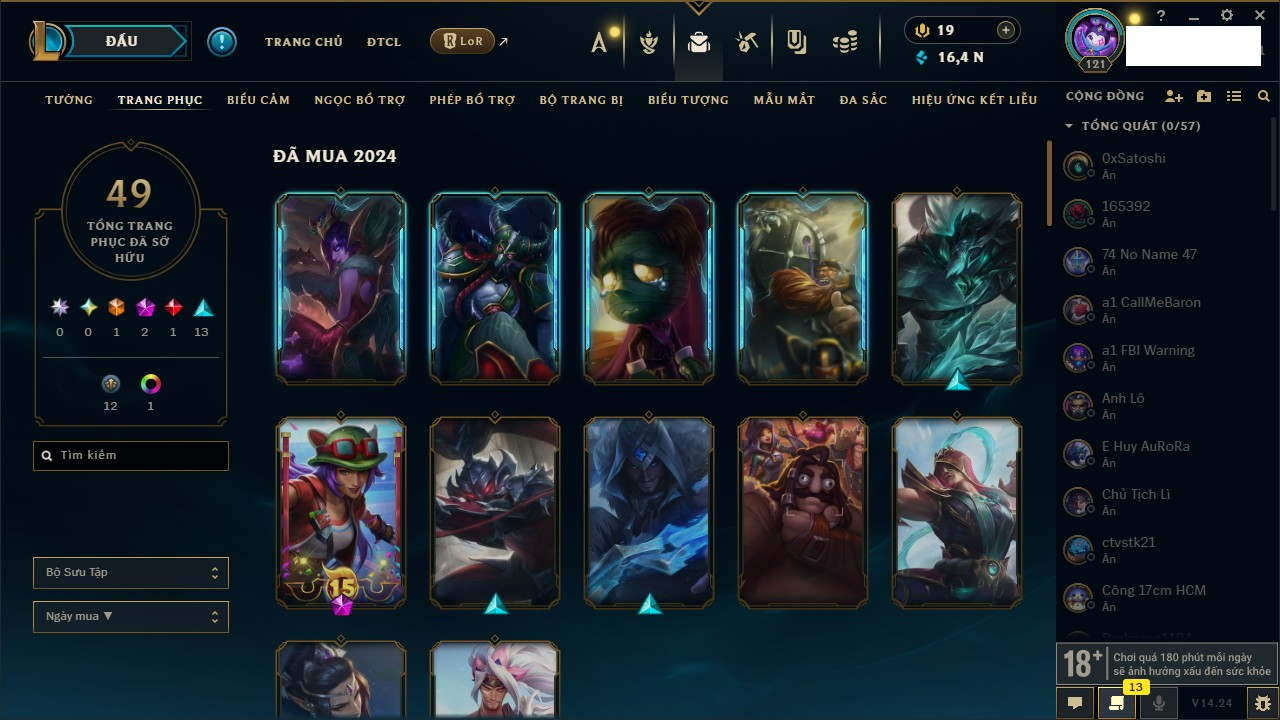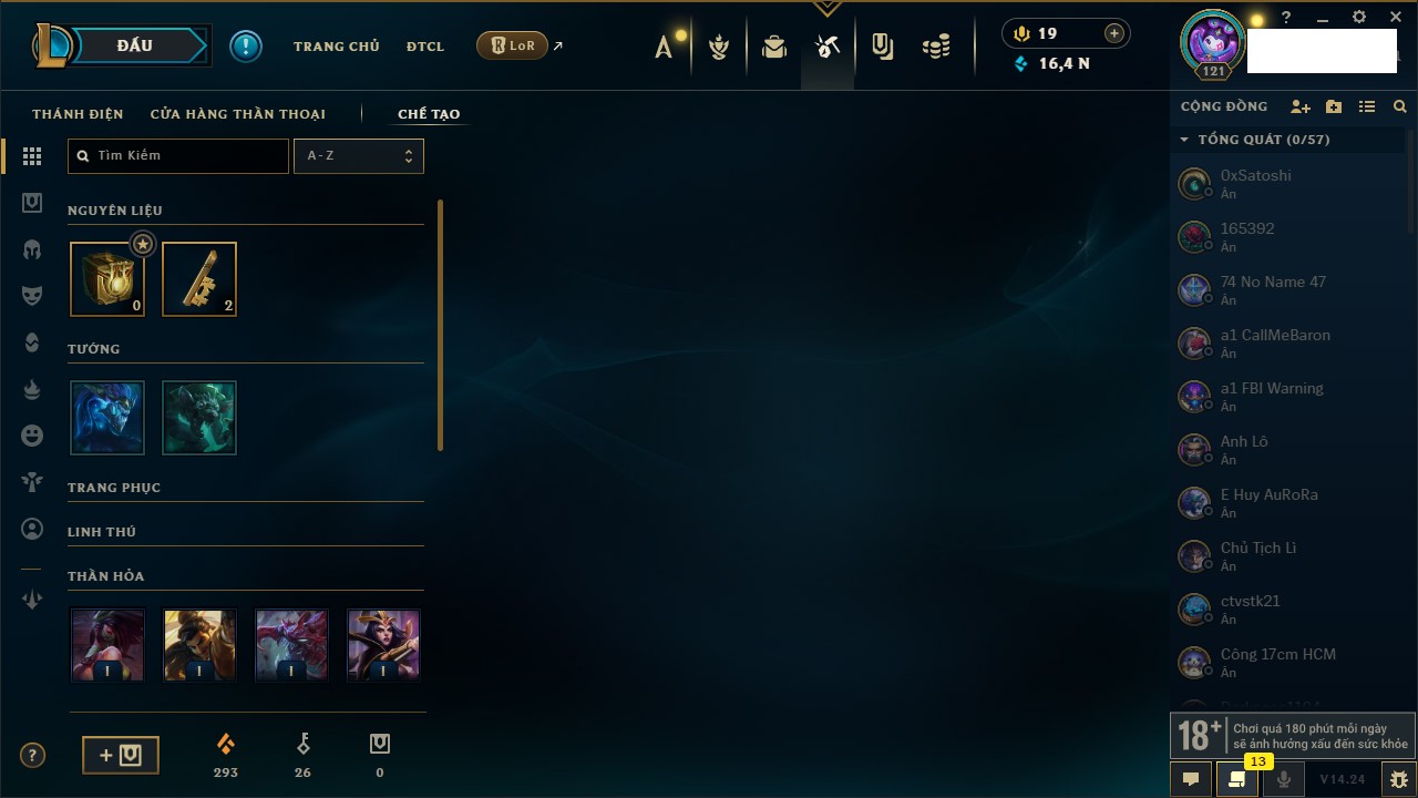 Rank Đơn: Chưa RankKhung: Chưa có khungTướng: 79 - Còn 2490 THXTrang Phục: 2Rank ĐTCL: Chưa RankLinh Thú: 26