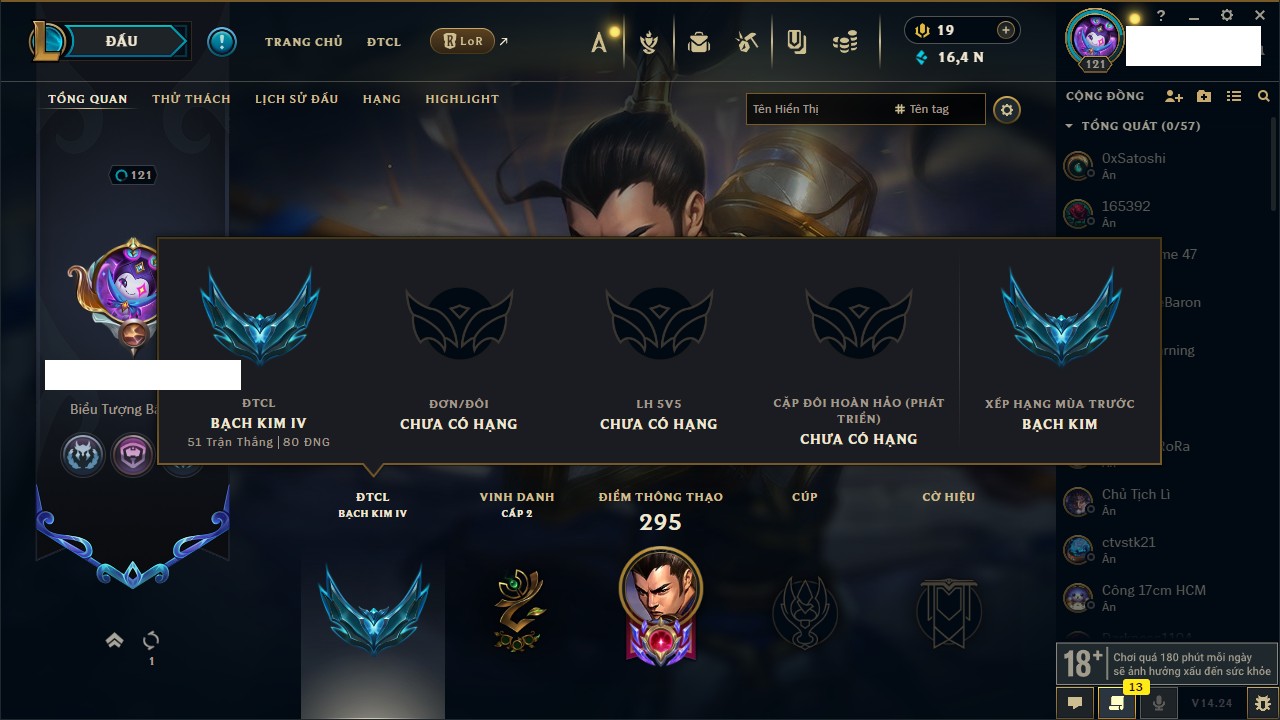 Rank Đơn: Chưa RankKhung: Chưa có khungTướng: 3 - Còn 34550 THXTrang Phục: 0Rank ĐTCL: Chưa RankLinh Thú: 41