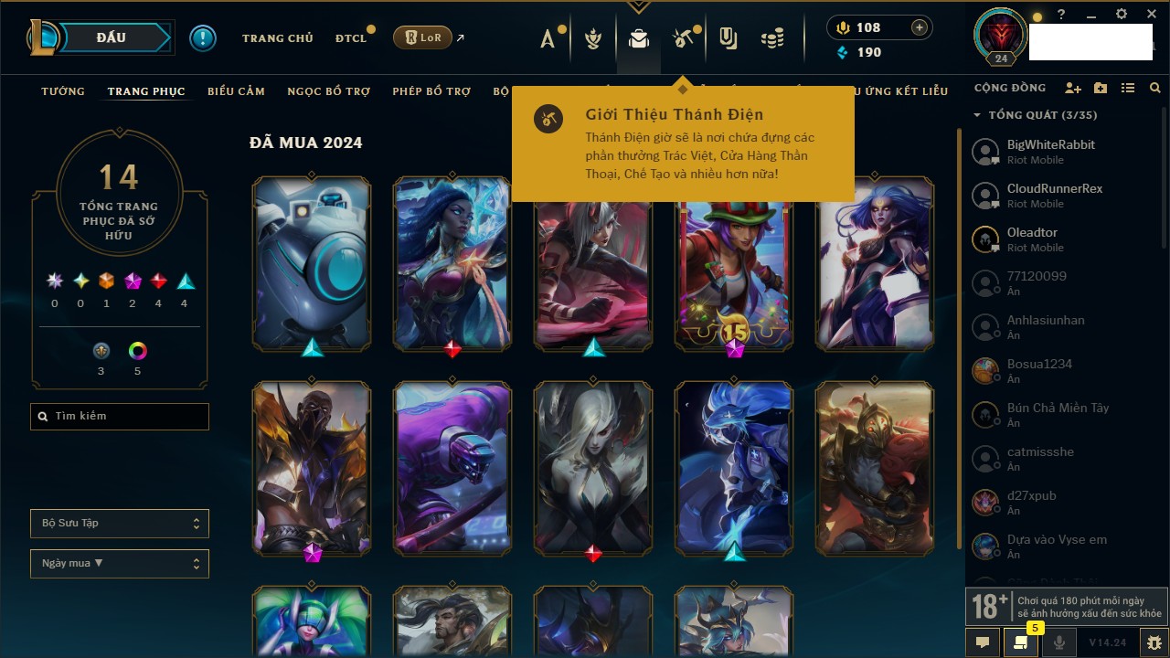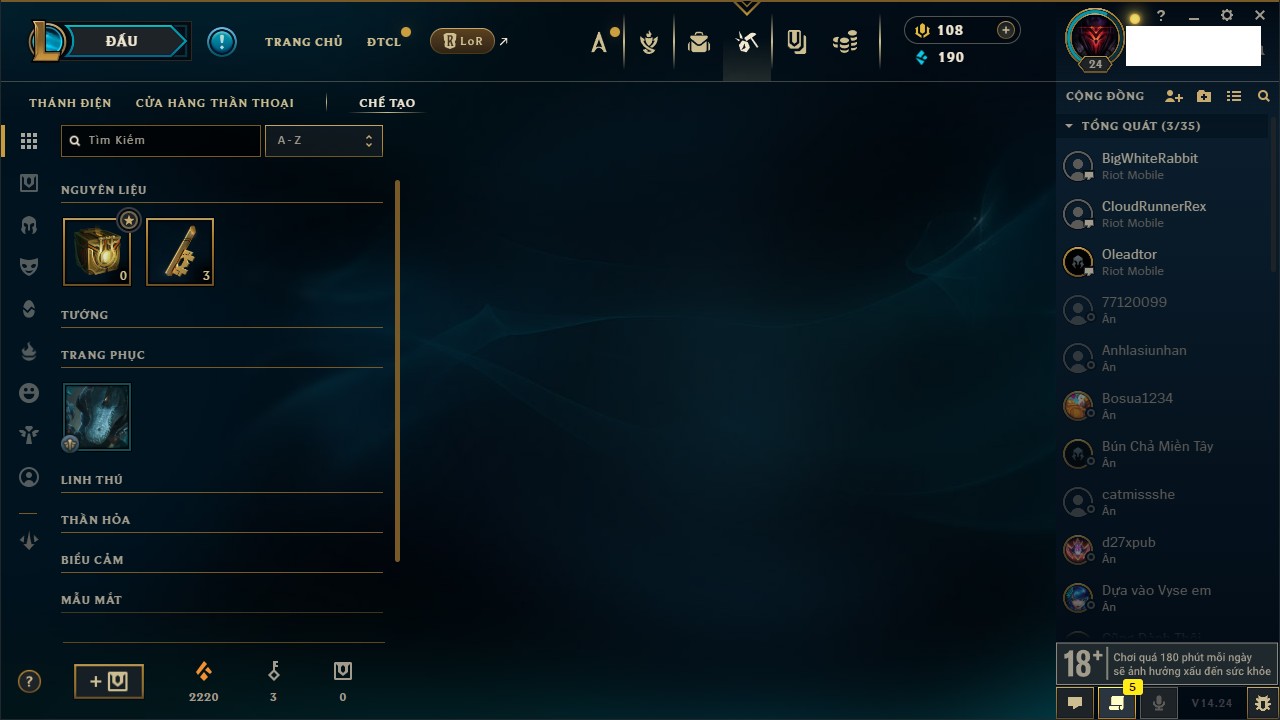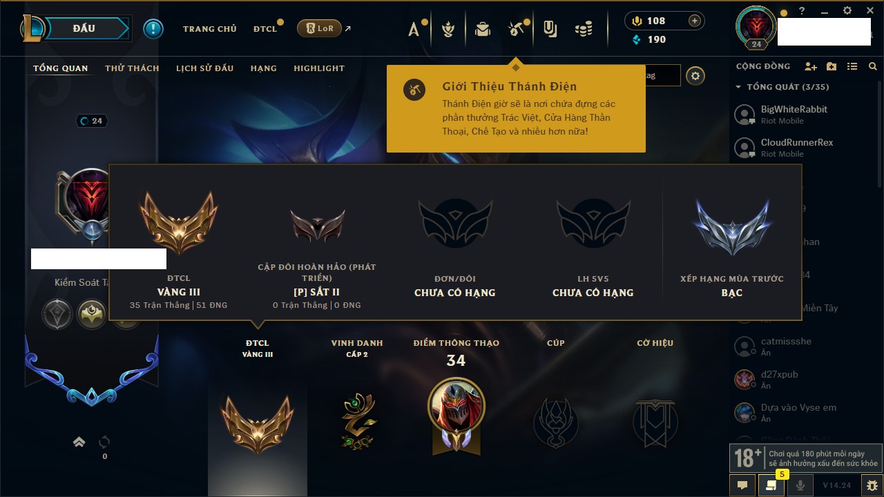 Rank Đơn: Chưa rank mùa nàoKhung: Chưa có khungTướng: 2 - Còn 9000 THXTrang Phục: 0Rank ĐTCL: Bạch Kim IIILinh Thú: 31
