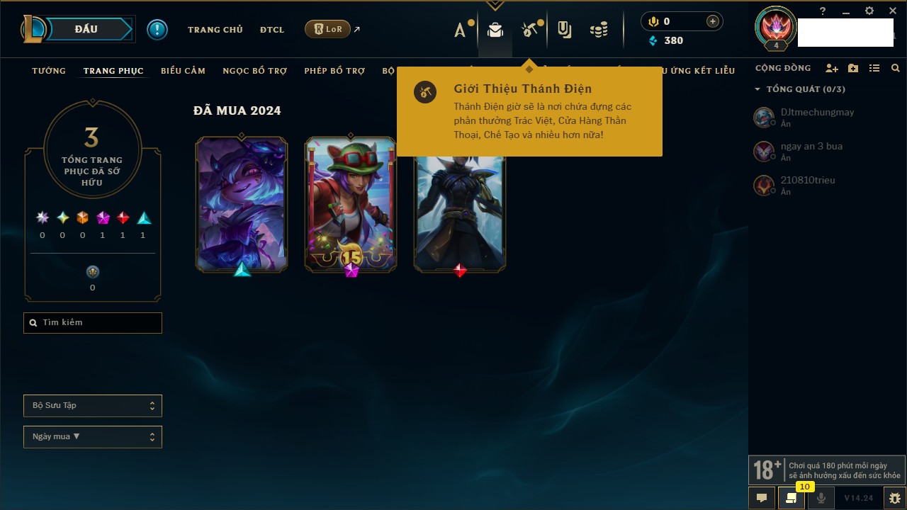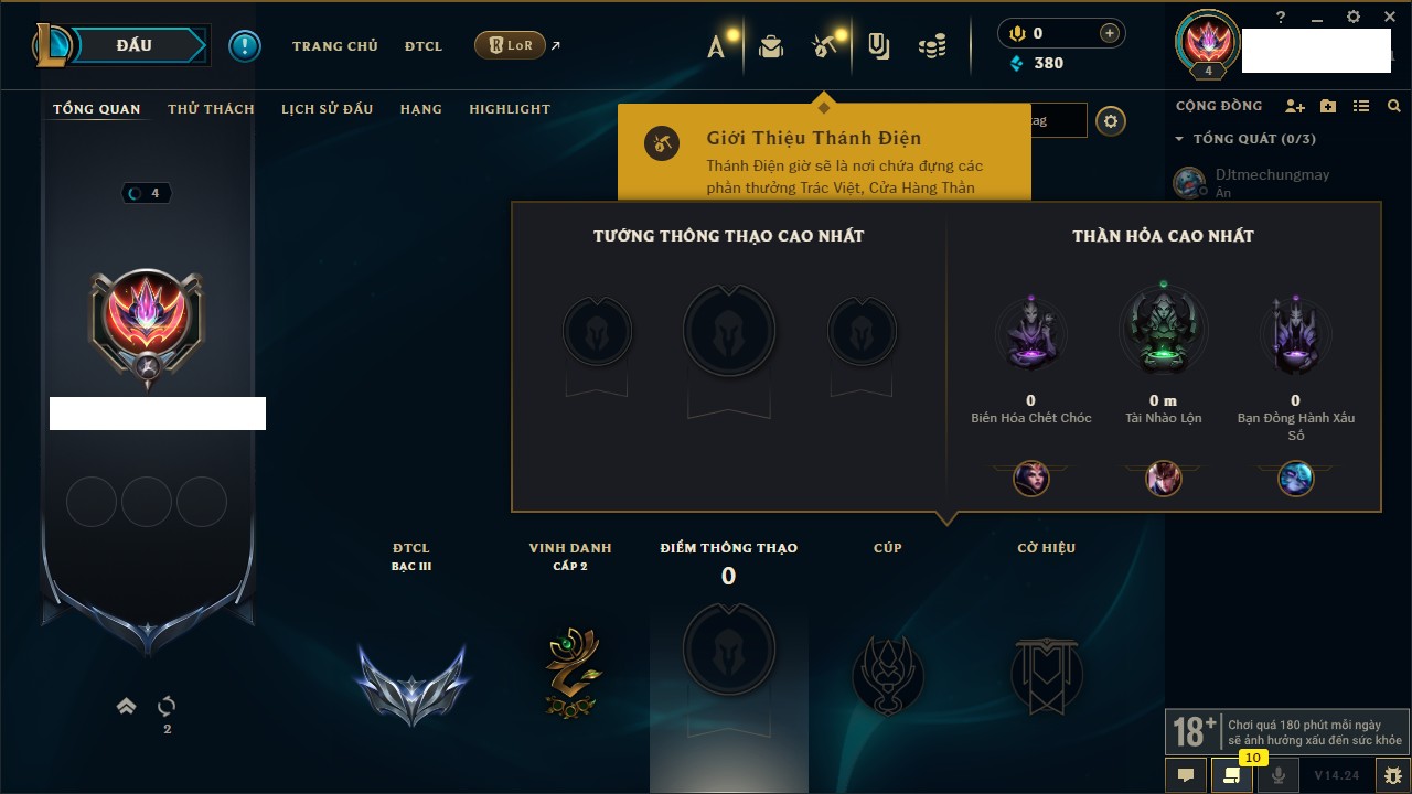 Rank Đơn: Chưa rank mùa nàoKhung: Chưa có khungTướng: 157 - Còn 12765 THXTrang Phục: 3Rank ĐTCL: Chưa RankLinh Thú: 78