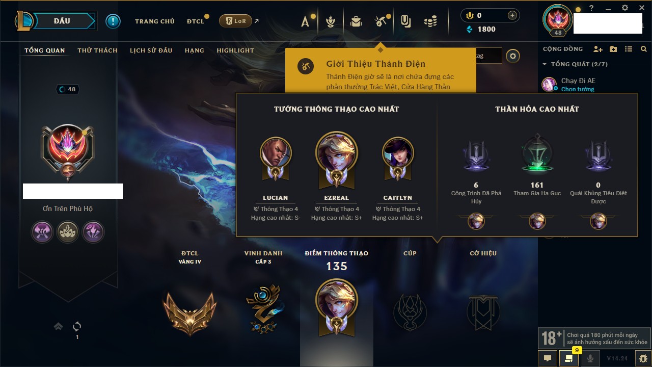 Rank Đơn: Chưa rank mùa nàoKhung: Chưa có khungTướng: 35 - Còn 3905 THXTrang Phục: 5Rank ĐTCL: Chưa RankLinh Thú: 22