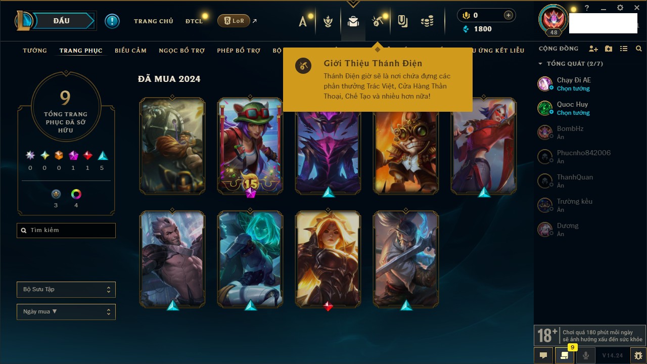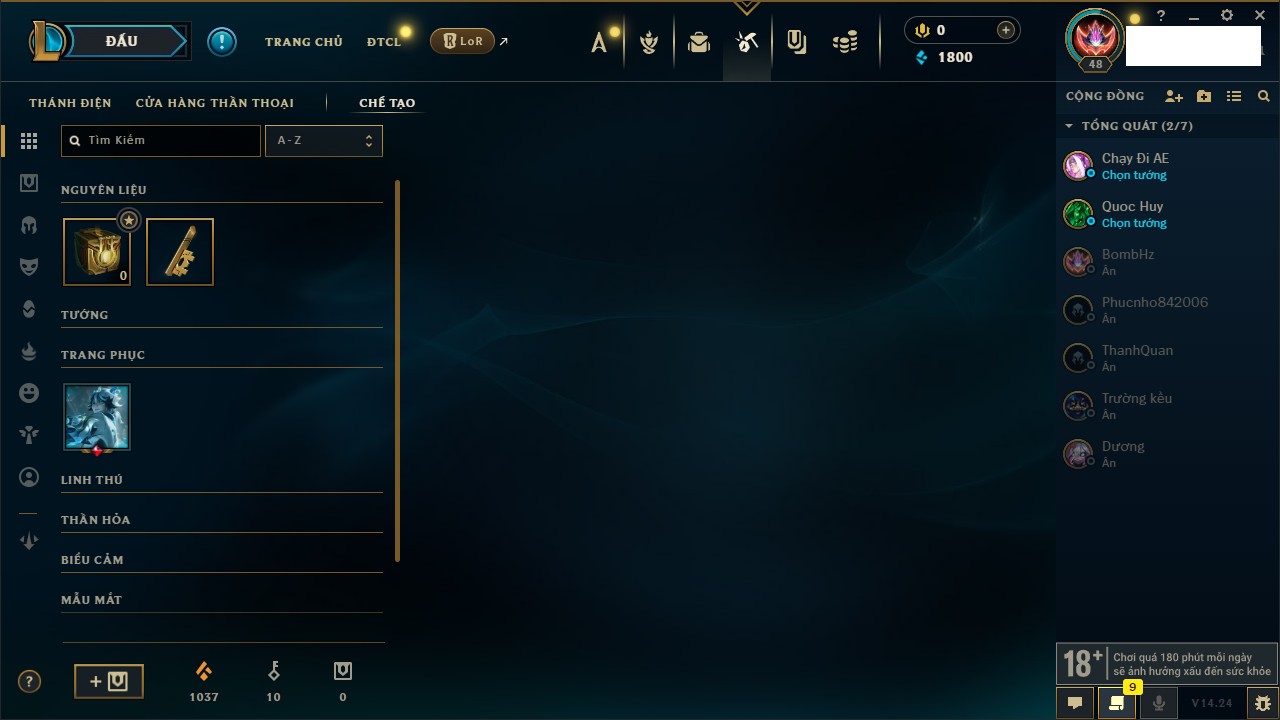 Rank Đơn: Chưa rank mùa nàoKhung: Chưa có khungTướng: 62 - Còn 2196 THXTrang Phục: 17Rank ĐTCL: Chưa RankLinh Thú: 88
