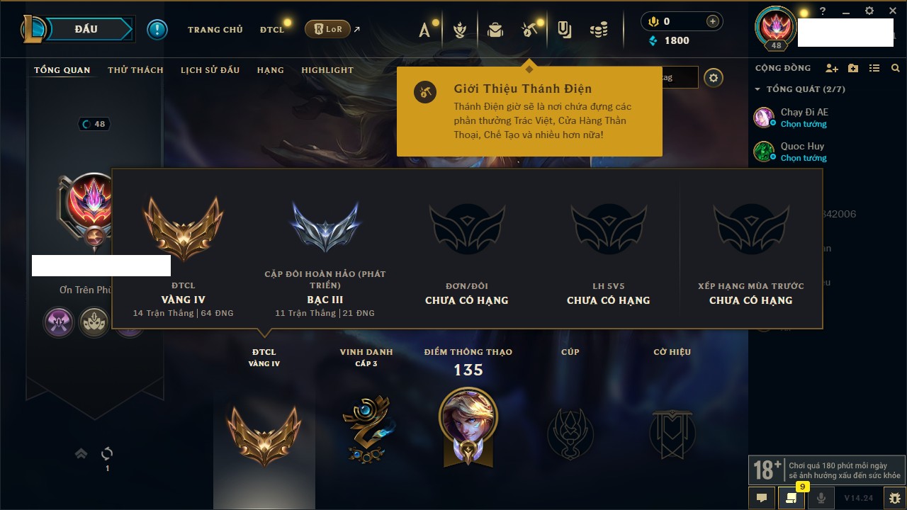 Rank Đơn: Chưa rank mùa nàoKhung: Chưa có khungTướng: 147 - Còn 13200 THXTrang Phục: 0Rank ĐTCL: Chưa RankLinh Thú: 2