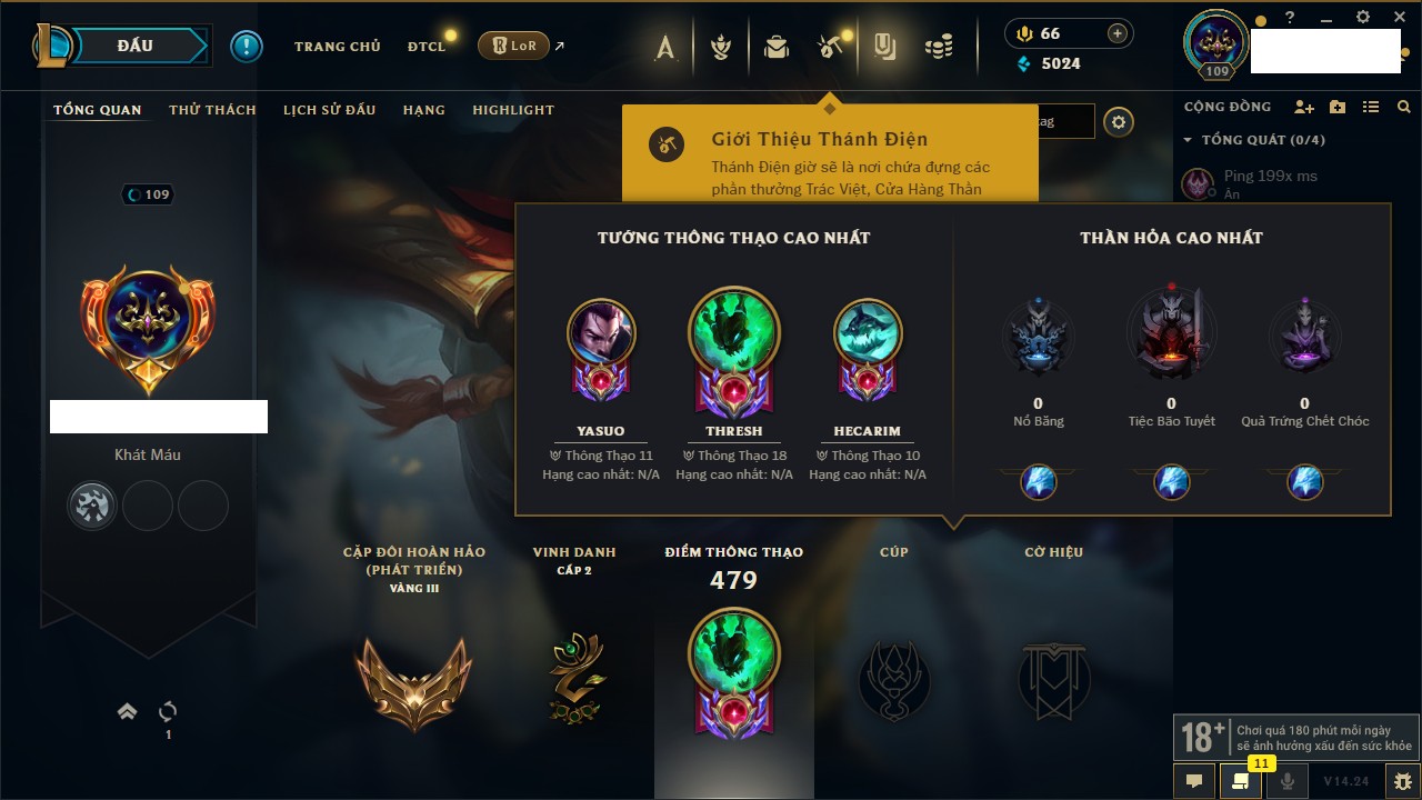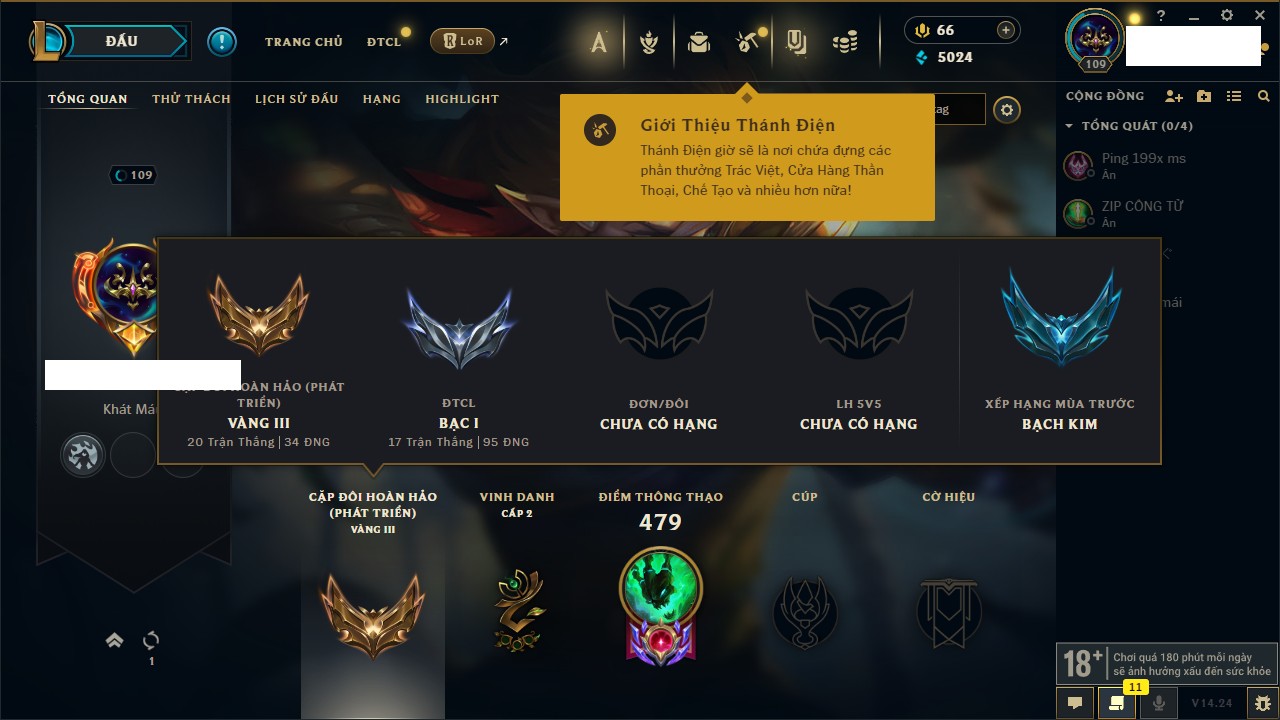 Rank Đơn: Chưa RankKhung: VàngTướng: 171 - Còn 207237 THXTrang Phục: 125Rank ĐTCL: Chưa RankLinh Thú: 112