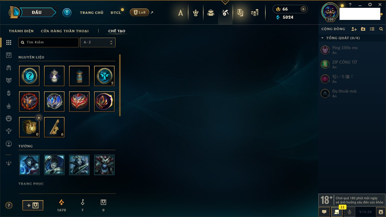 Rank Đơn: Chưa RankKhung: Chưa có khungTướng: 160 - Còn 21398 THXTrang Phục: 380Rank ĐTCL: Chưa RankLinh Thú: 27