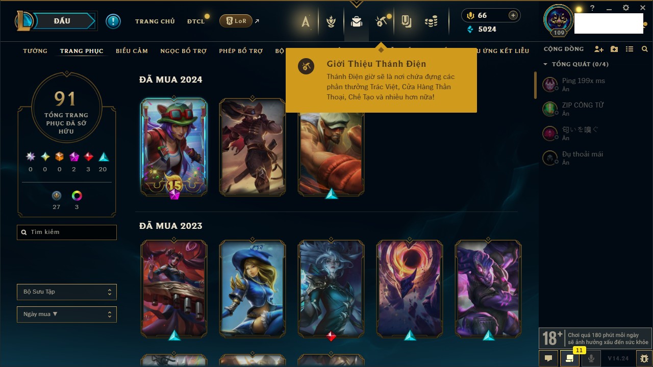 Rank Đơn: Chưa RankKhung: ĐồngTướng: 172 - Còn 66370 THXTrang Phục: 49Rank ĐTCL: Chưa RankLinh Thú: 243
