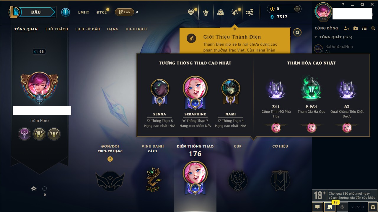 Rank Đơn: Chưa rank mùa nàoKhung: Chưa có khungTướng: 3 - Còn 34550 THXTrang Phục: 0Rank ĐTCL: Bạch Kim IVLinh Thú: 41