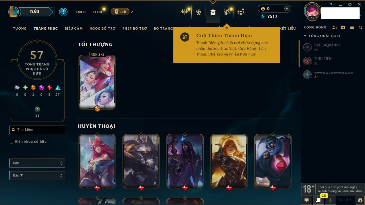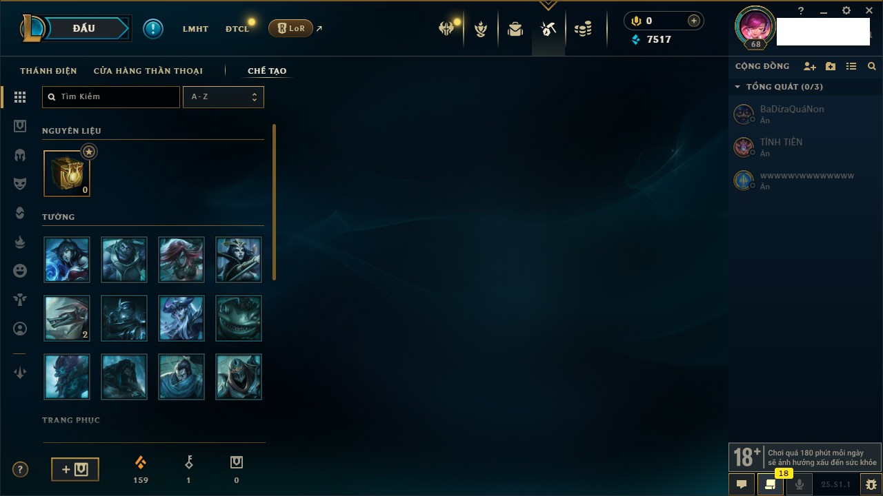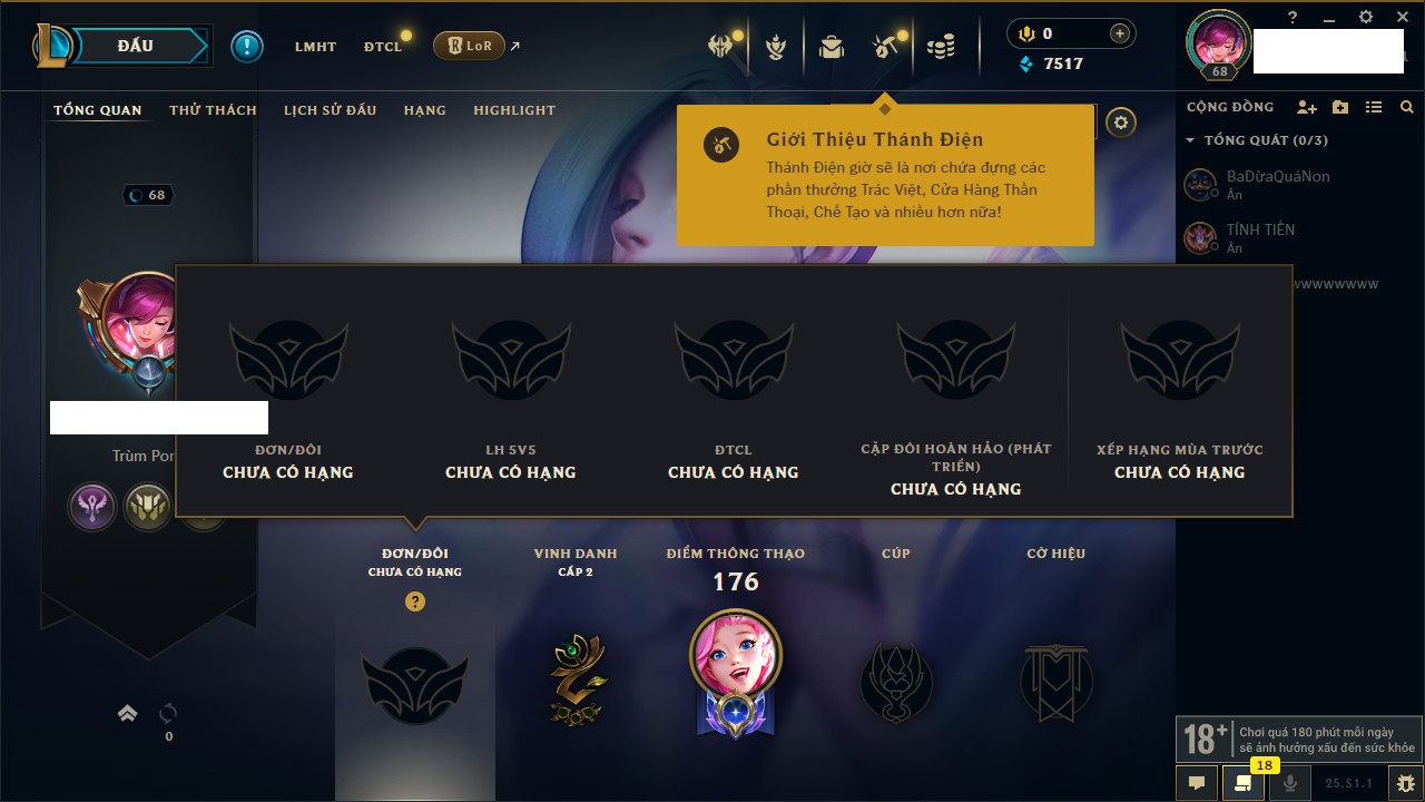 Rank Đơn: Chưa RankKhung: Chưa có khungTướng: 157 - Còn 18505 THXTrang Phục: 7Rank ĐTCL: Chưa RankLinh Thú: 20