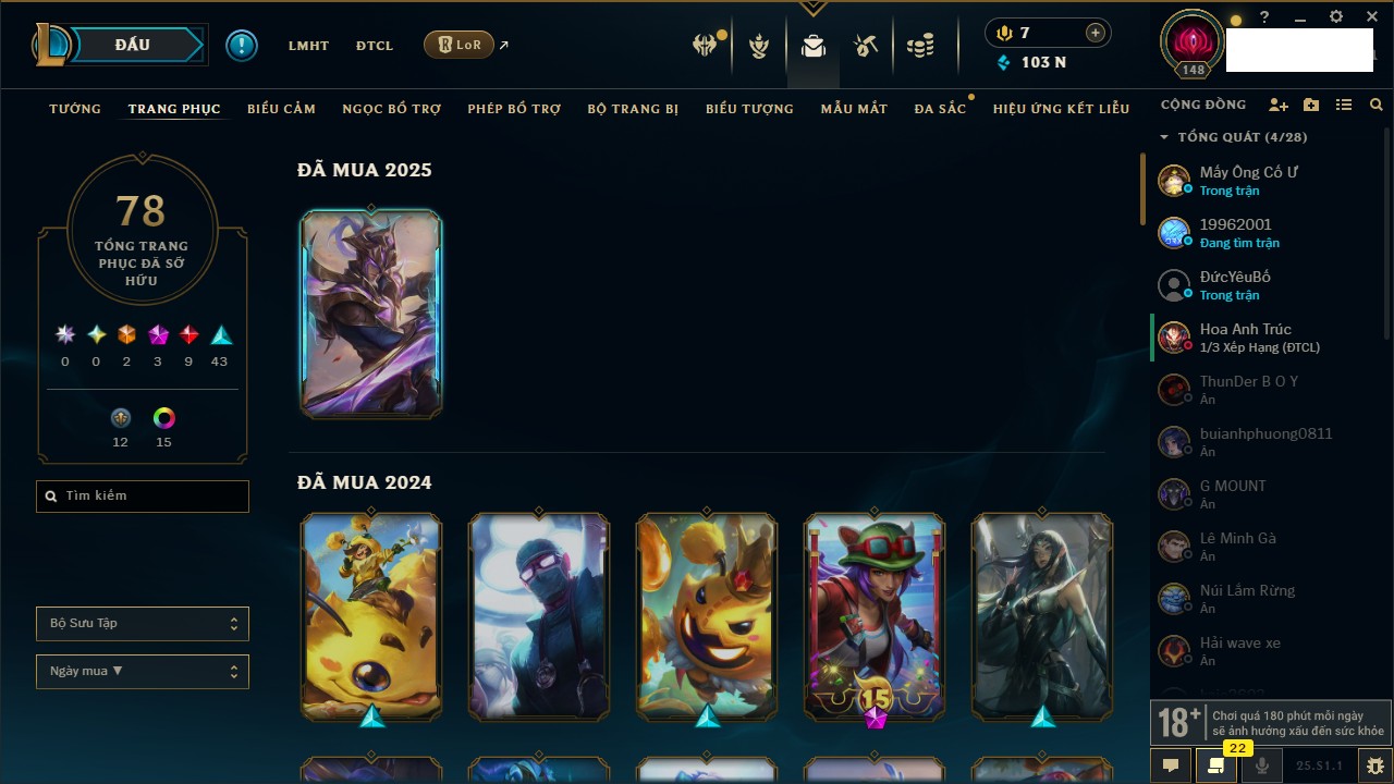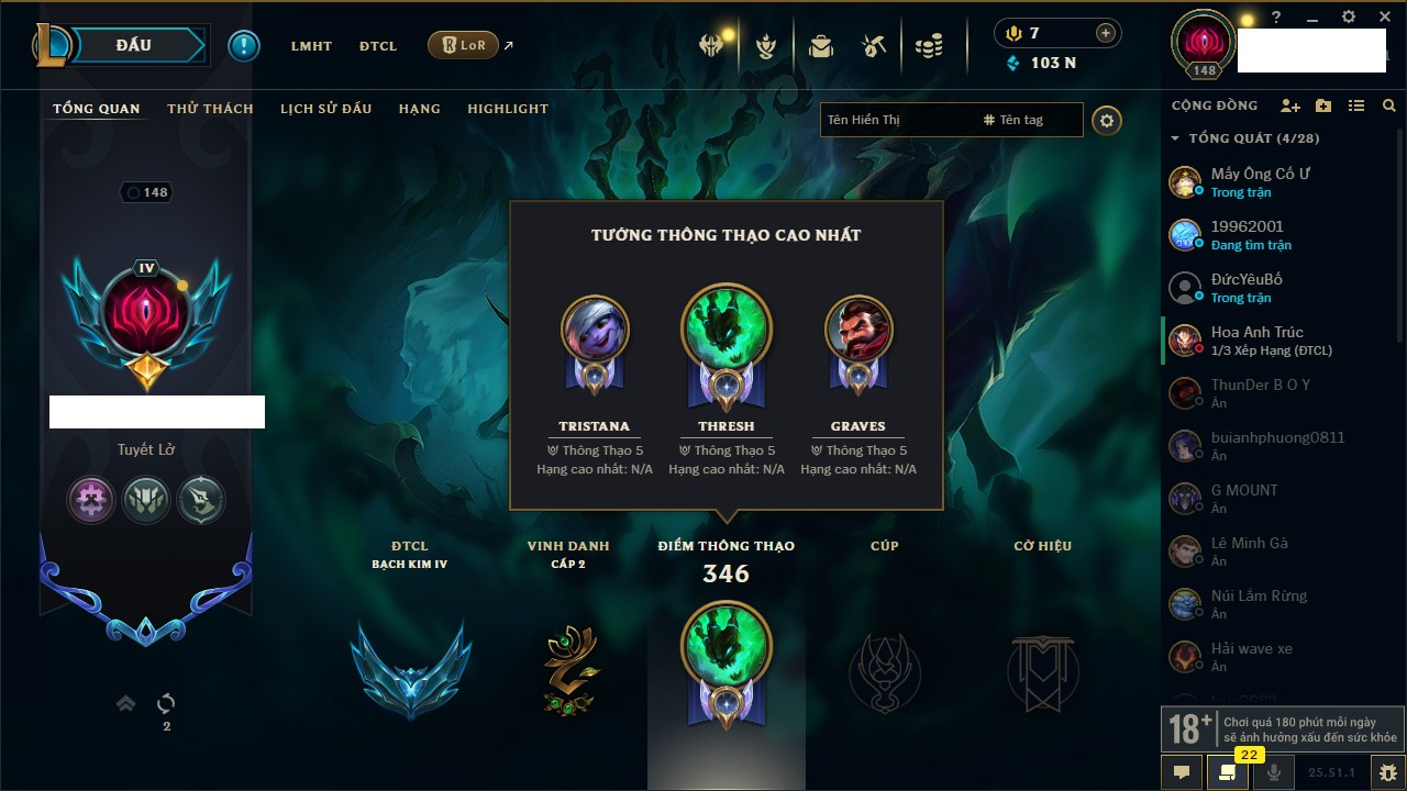 Rank Đơn: Bạch Kim IIIKhung: Bạch kimTướng: 59 - Còn 20316 THXTrang Phục: 29Rank ĐTCL: Chưa RankLinh Thú: 3
