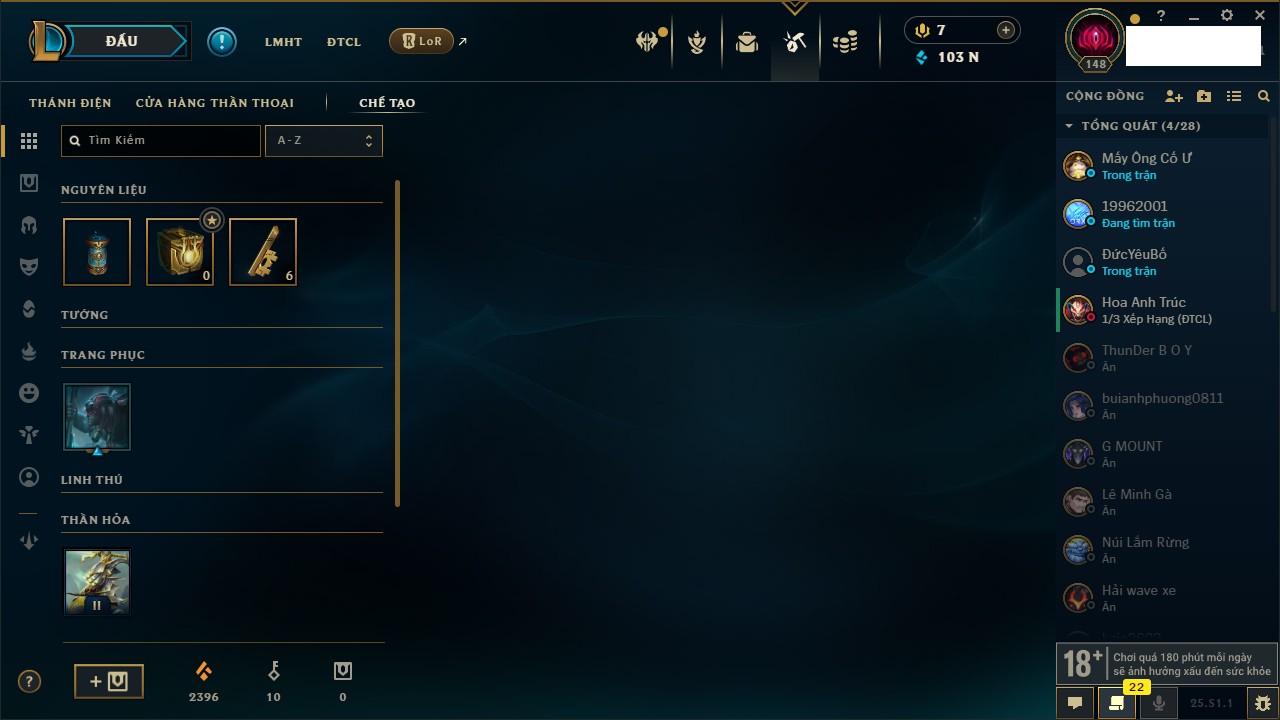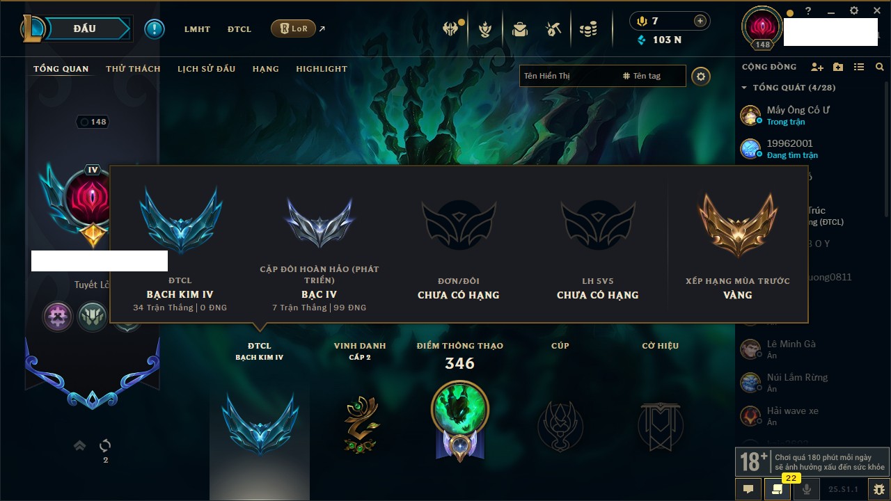 Rank Đơn: Chưa rank mùa nàoKhung: Chưa có khungTướng: 3 - Còn 32650 THXTrang Phục: 0Rank ĐTCL: Bạch Kim IVLinh Thú: 66