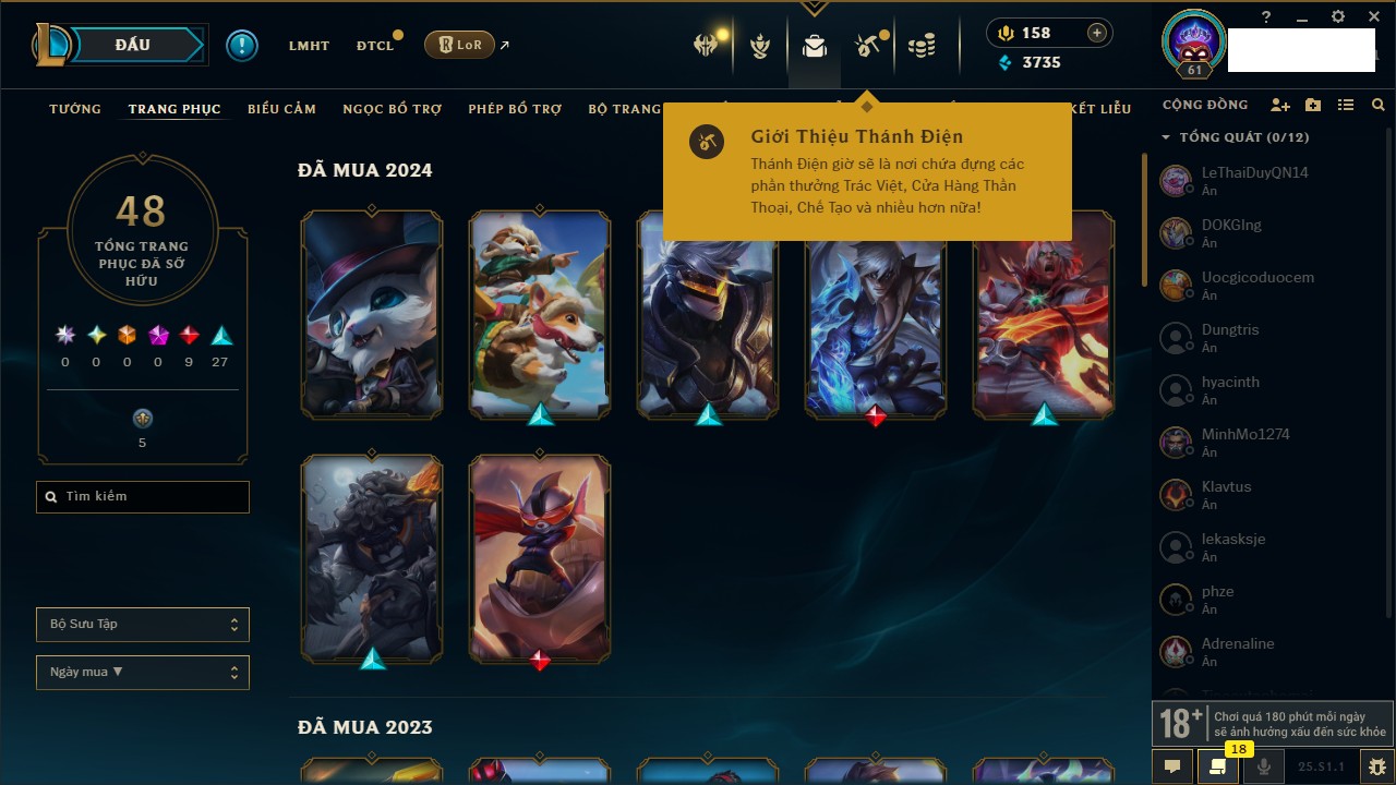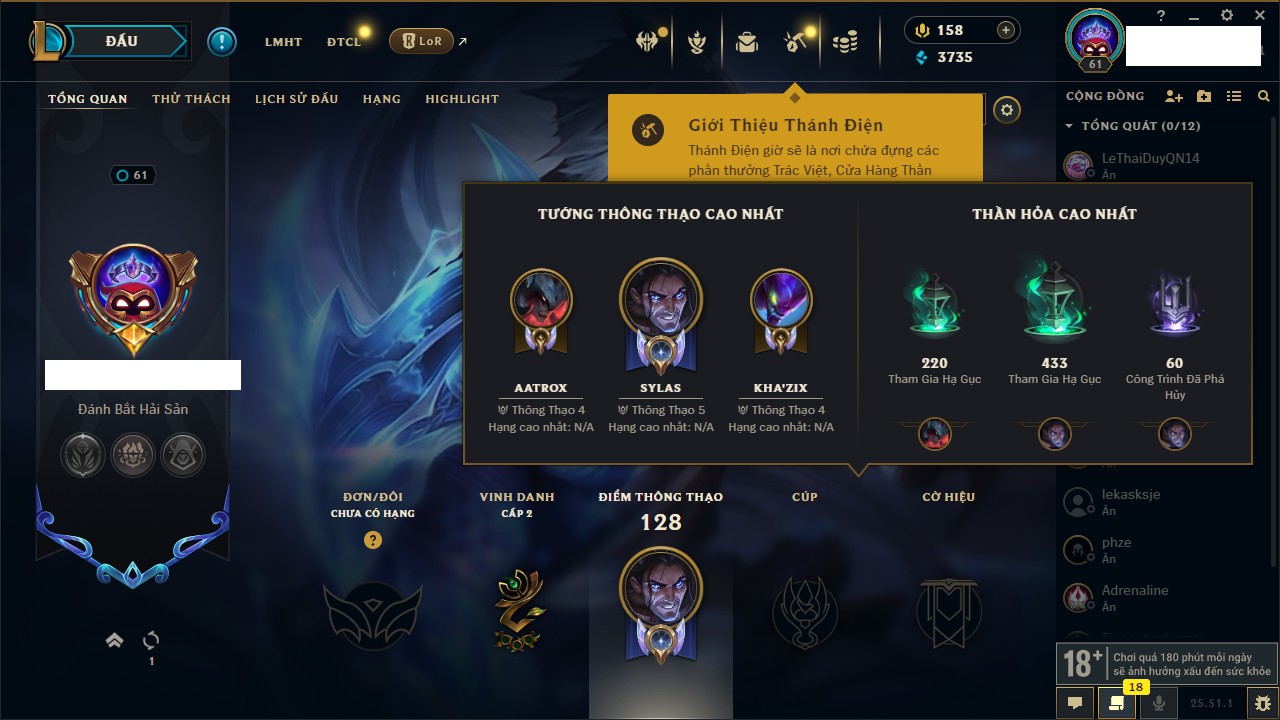 Rank Đơn: Đồng IIIKhung: Chưa có khungTướng: 165 - Còn 26276 THXTrang Phục: 61Rank ĐTCL: Chưa RankLinh Thú: 32