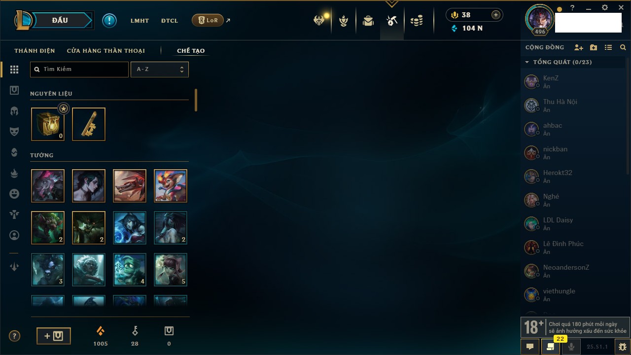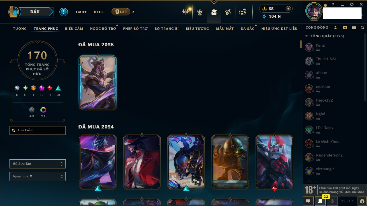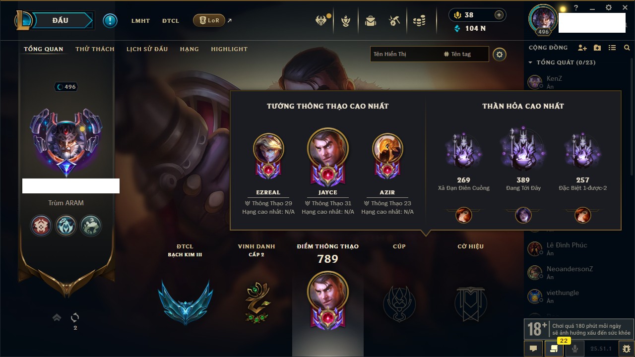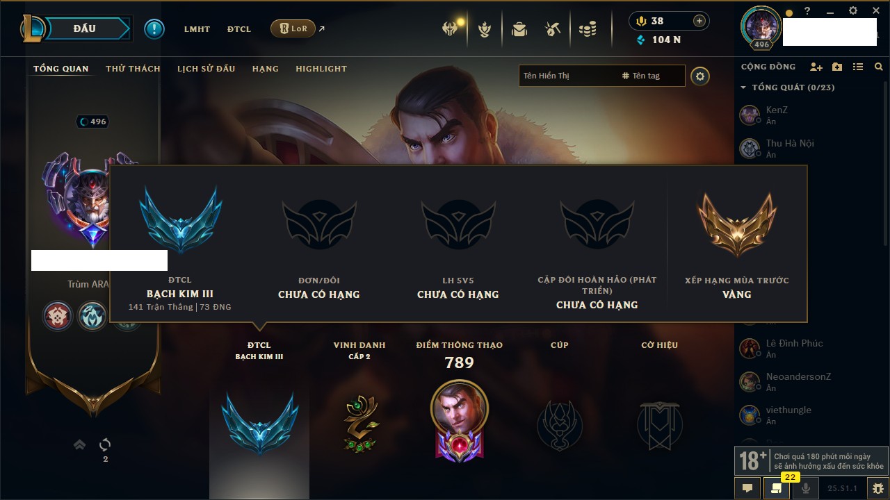 Rank Đơn: Đồng IIKhung: Chưa có khungTướng: 170 - Còn 56487 THXTrang Phục: 90Rank ĐTCL: Chưa RankLinh Thú: 129