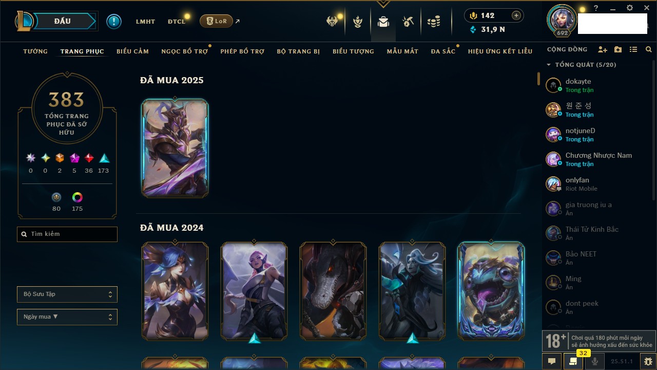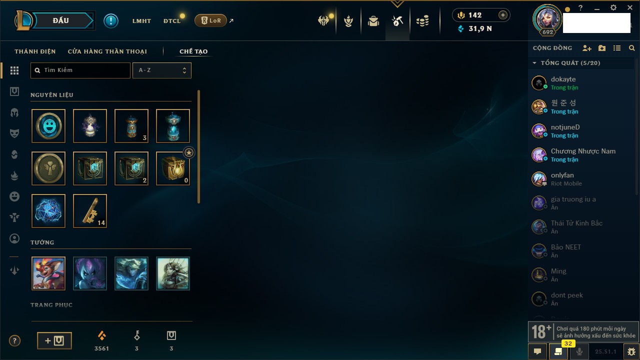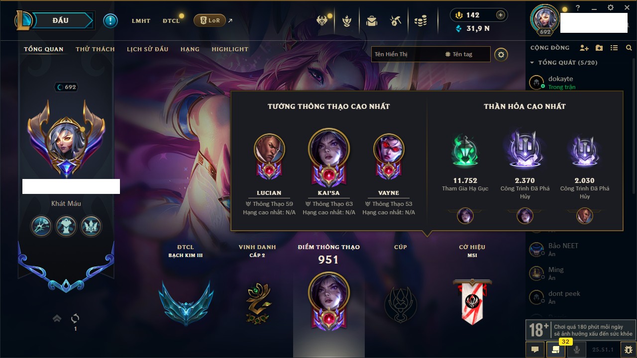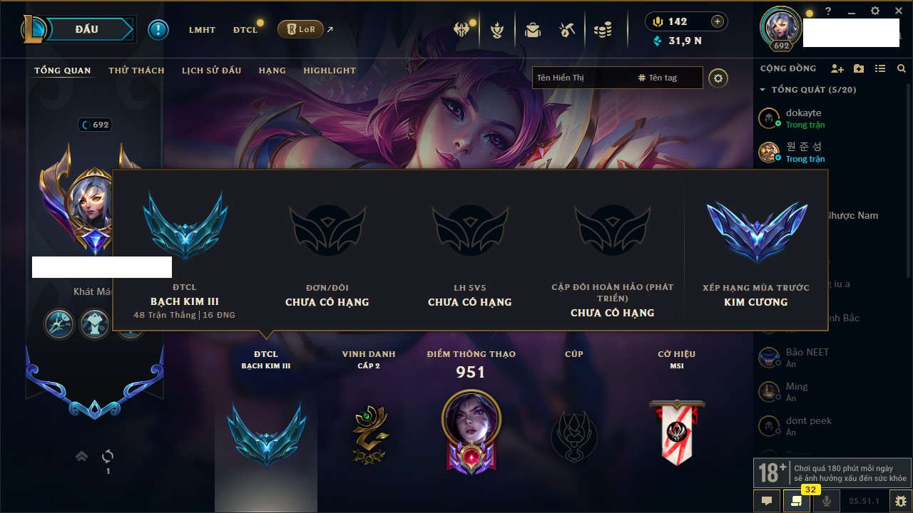 Rank Đơn: Chưa RankKhung: Bạch kimTướng: 171 - Còn 250924 THXTrang Phục: 355Rank ĐTCL: Chưa RankLinh Thú: 230