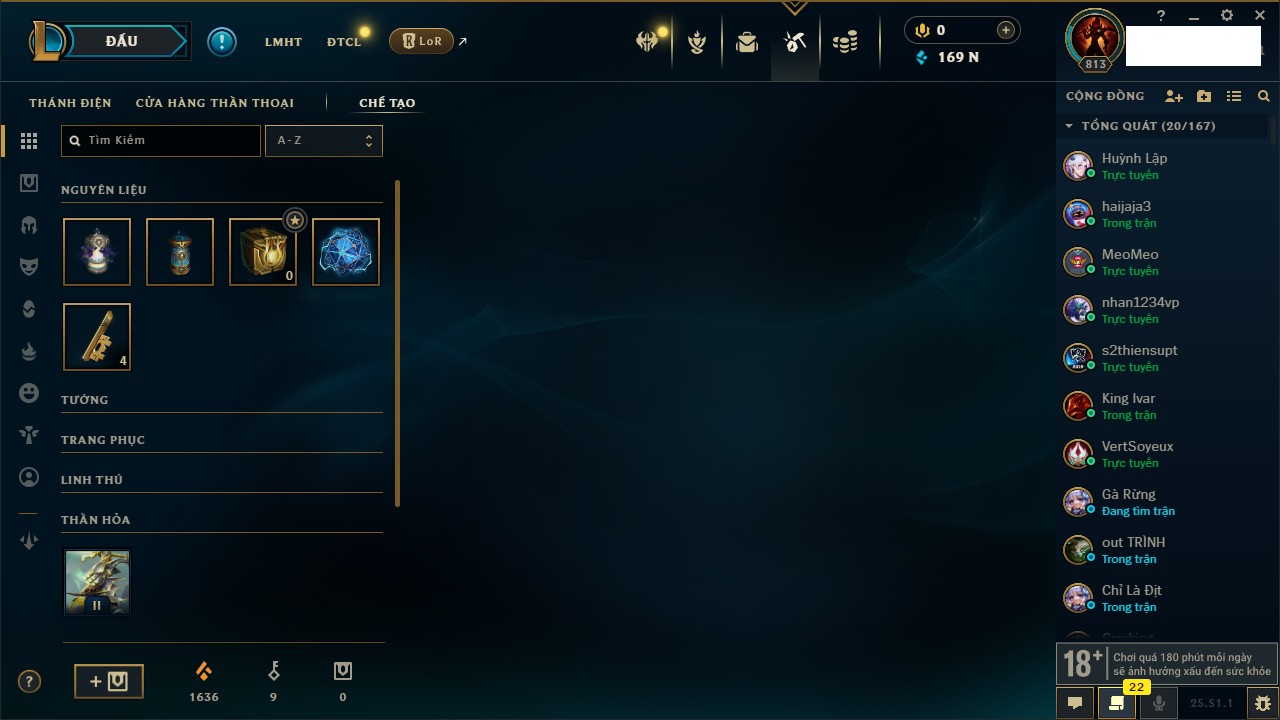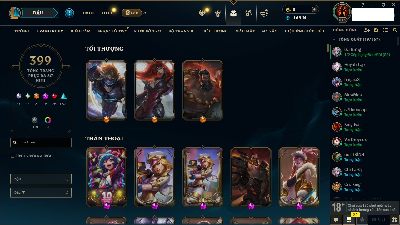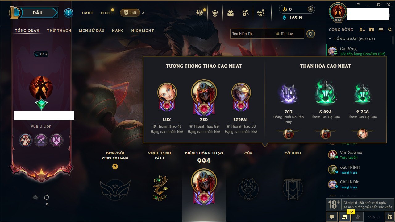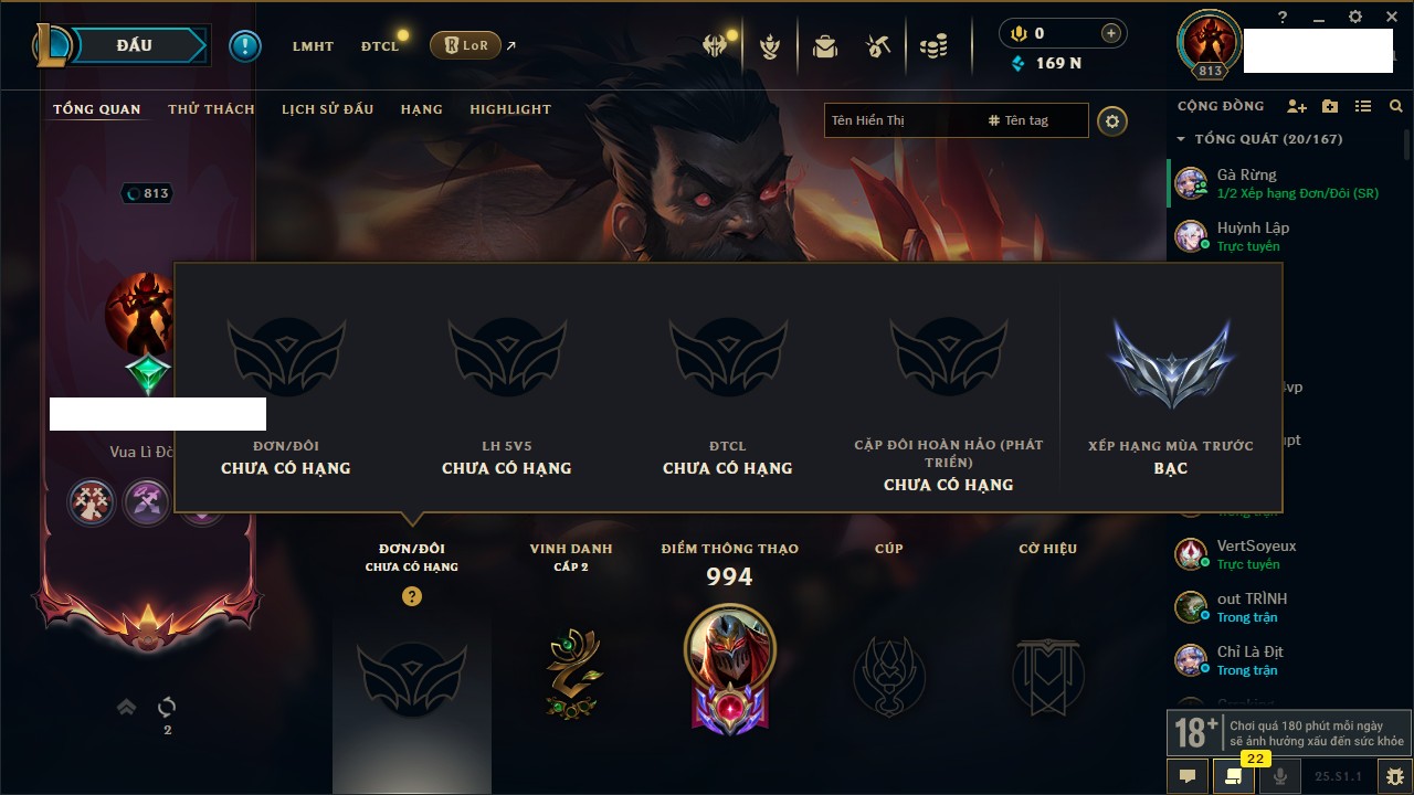 Rank Đơn: Chưa RankKhung: Chưa có khungTướng: 169 - Còn 43188 THXTrang Phục: 205Rank ĐTCL: Chưa RankLinh Thú: 259